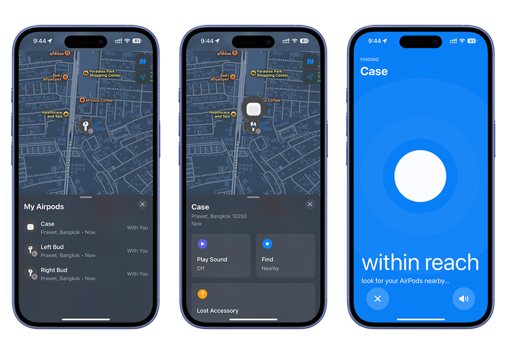 AirPods ทุกคู่ผูกกับ “ค้นหาของฉัน” ได้ครบทุกอุปกรณ์ ส่วนรุ่นที่มี ANC อย่าง AirPods Pro 2 หรือ AirPods 4 จะสั่งให้ส่งเสียงดัง 2-3 นาทีเอาไว้ตามหาได้ง่ายขึ้น