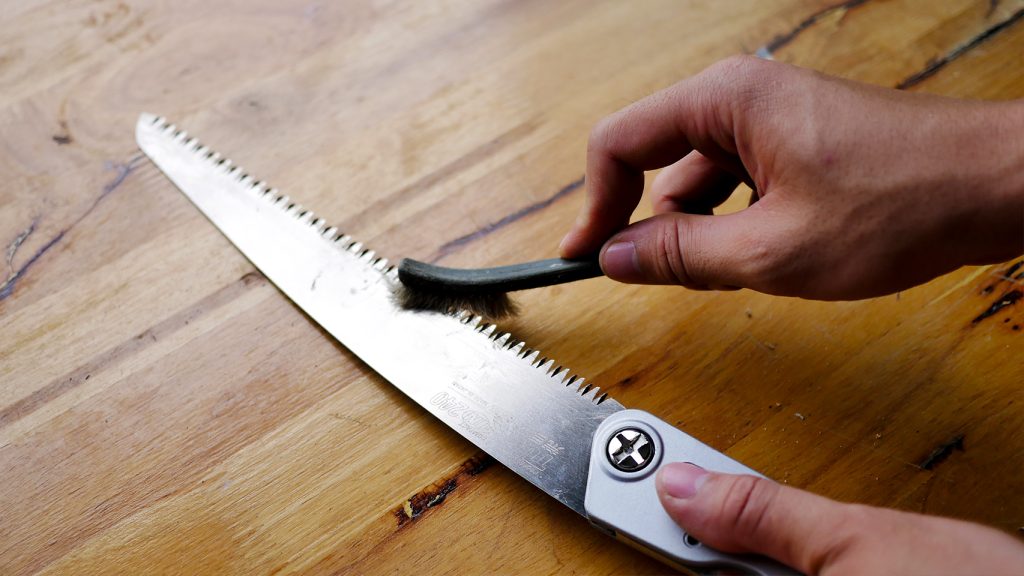 ใช้แปรงขนนุ่มหรือผ้าเช็ดเศษไม้ ยางไม้ หรือเรซินที่เกาะอยู่ ถ้าคราบเหนียวมาก ใช้น้ำยาทำความสะอาดหรือแอลกอฮอล์ช่วยได้ทาน้ำมันกันสนิม