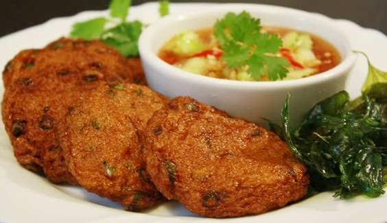 เสิร์ฟทอดมันปลากรายเป็นชิ้นพอดีคำ จัดเรียงให้เห็นผิวสีทองที่เกิดจากการทอด