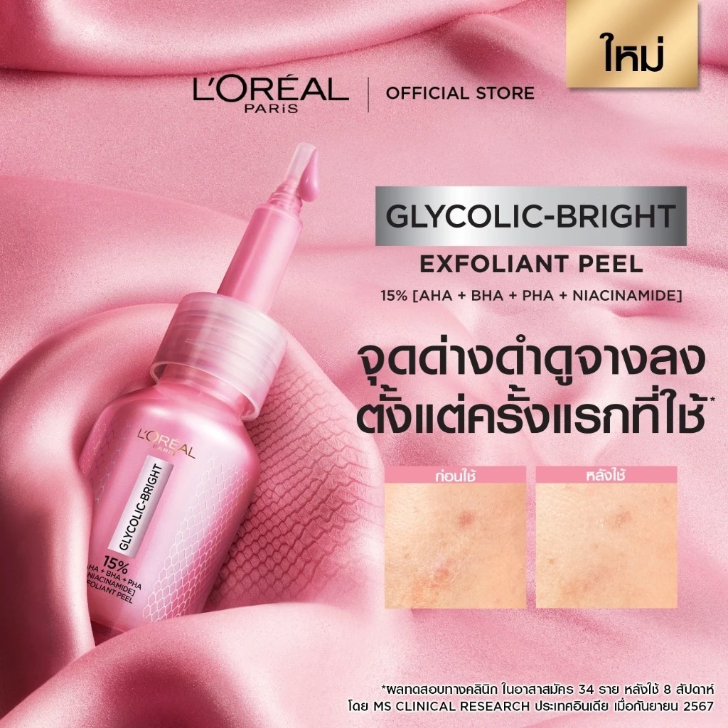 ตัวที่หยิบมาลองคือ L'Oréal Paris Glycolic Bright Anti-Dark Spot Exfoliant Peel พีลลิ่งมาส์กสีชมพูขวดเล็ก ๆ