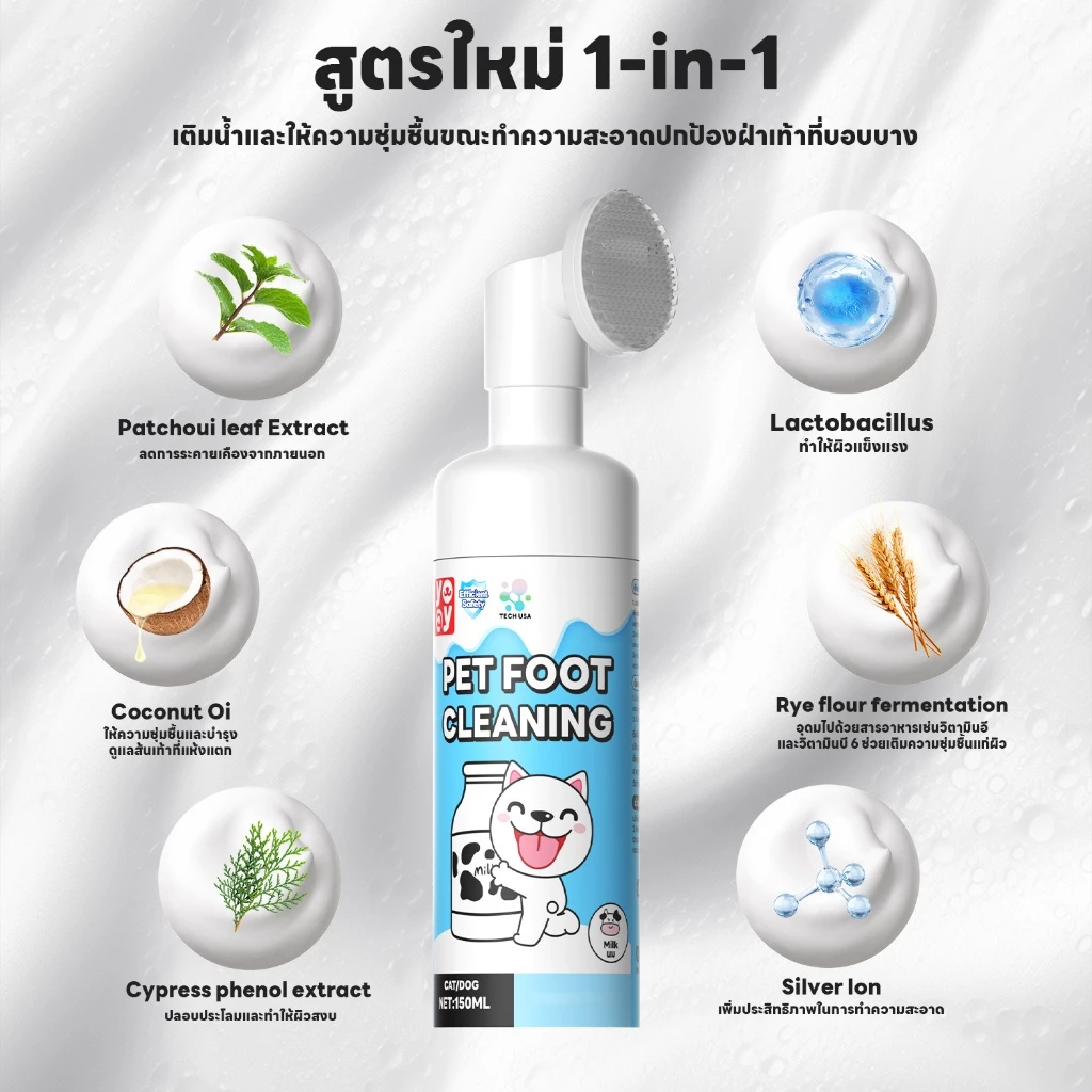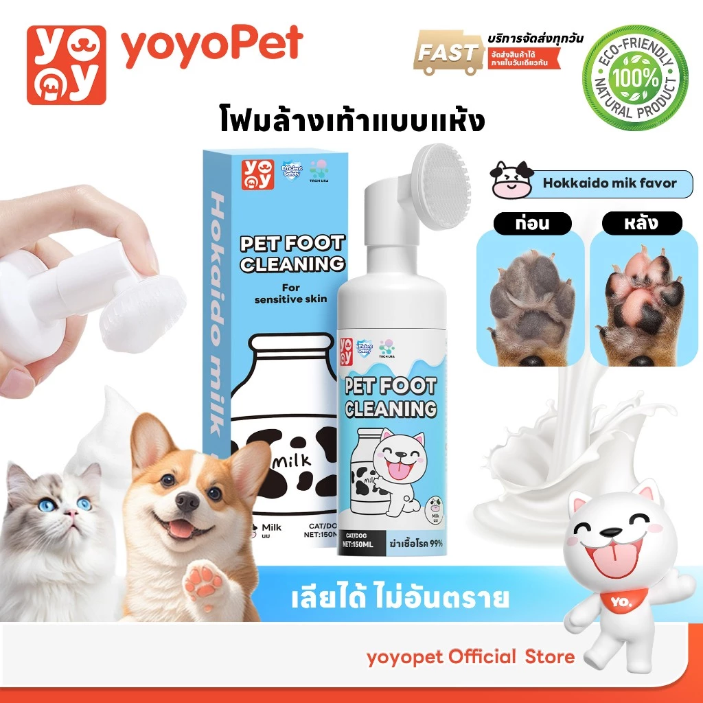 YoYo Pet: โฟมทำความสะอาดเท้าสัตว์เลี้ยง กลิ่นนมฮอกไกโด คือผลิตภัณฑ์ทำความสะอาดเท้าสำหรับสัตว์เลี้ยงในรูปแบบโฟมนุ่ม ใช้งานง่าย มาพร้อมหัวแปรงซิลิโคนถอดได้ ช่วยขจัดคราบสกปรกอย่างอ่อนโยน