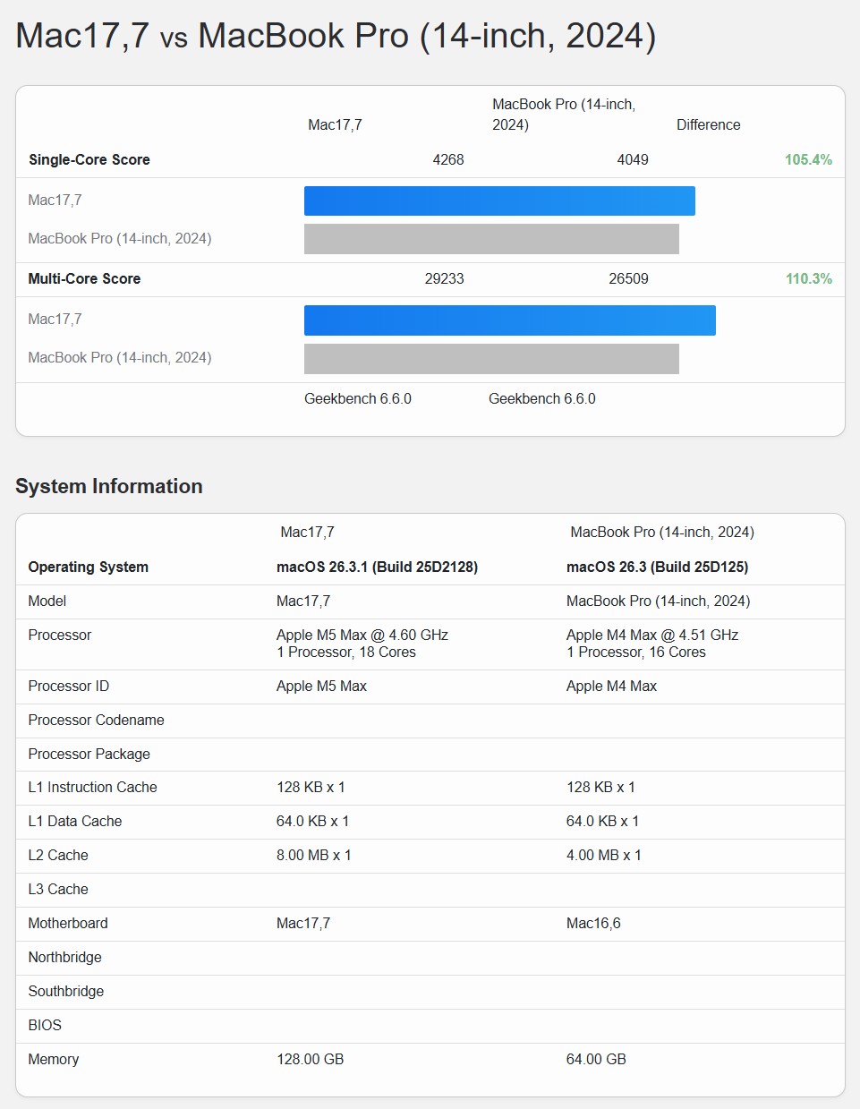 ผล benchmark ล่าสุดเผยว่า Apple M5 Max มีประสิทธิภาพเพิ่มขึ้นจาก M4 Max ประมาณ 10% ในงาน multi-core และราว 5% ใน single-core
