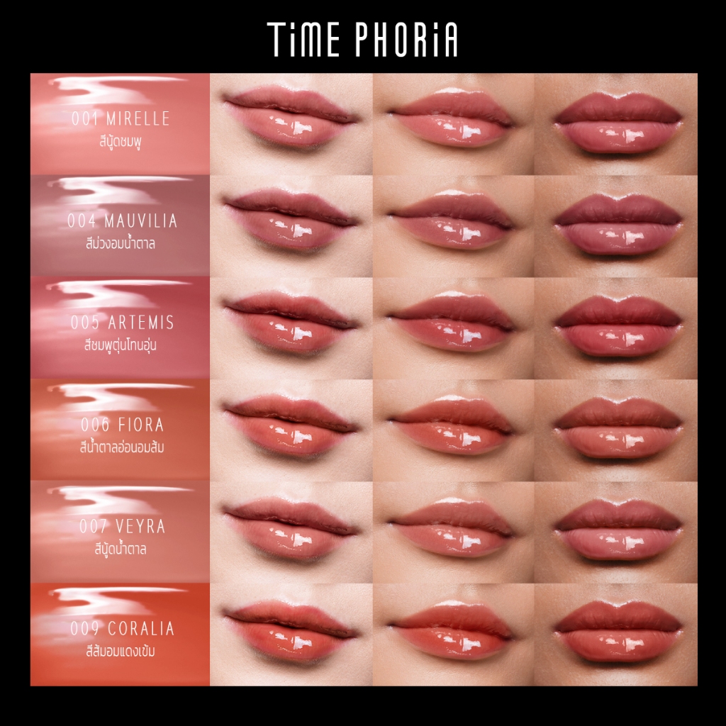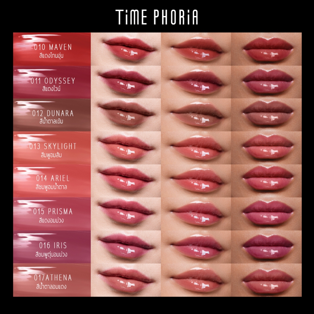 Time Phoria Lunara Frost 3D Lip Gloss มาพร้อมเฉดสีให้เลือกหลากหลาย ตั้งแต่สายหวาน สายสุภาพ ไปจนถึงสายมั่นใจ โทนเข้ม มีมิติ