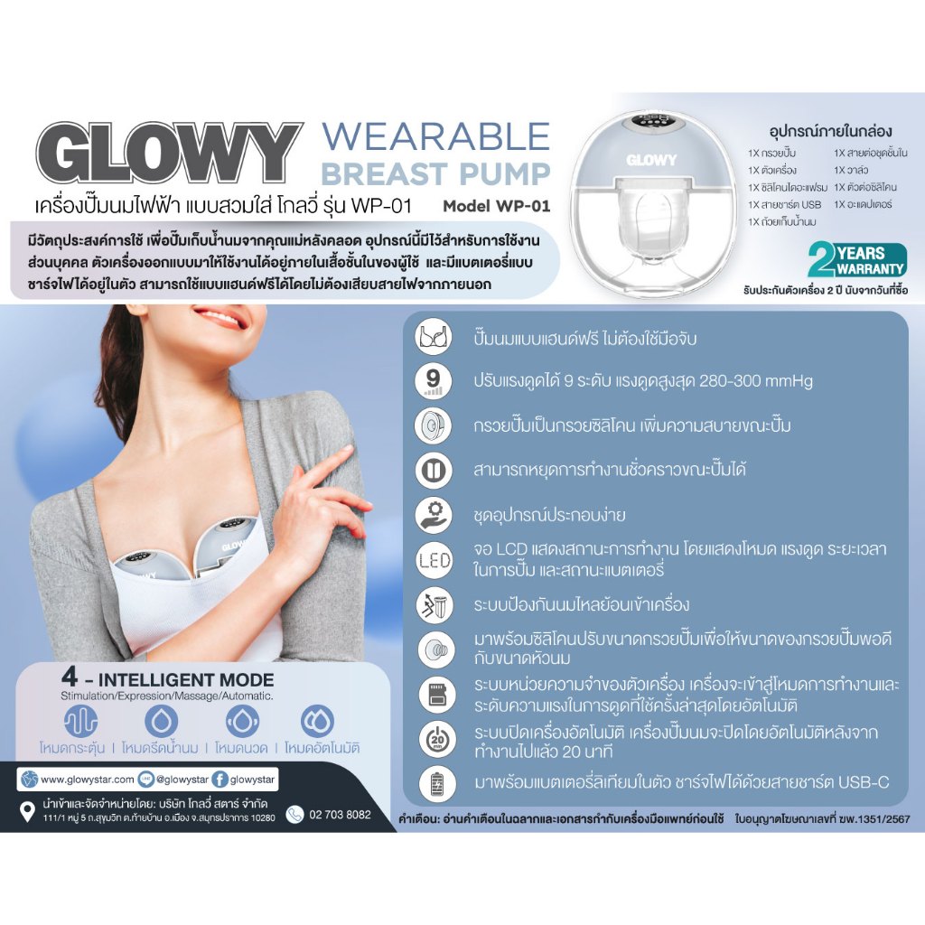 เพื่อให้คุณแม่มีข้อมูลที่ครบถ้วนในการตัดสินใจ มาดูรายละเอียดของ Glowy รุ่น WP-01 ซึ่งถูกออกแบบมาเพื่อความสะดวกสบายและรองรับการใช้งานในหลากหลายสถานการณ์