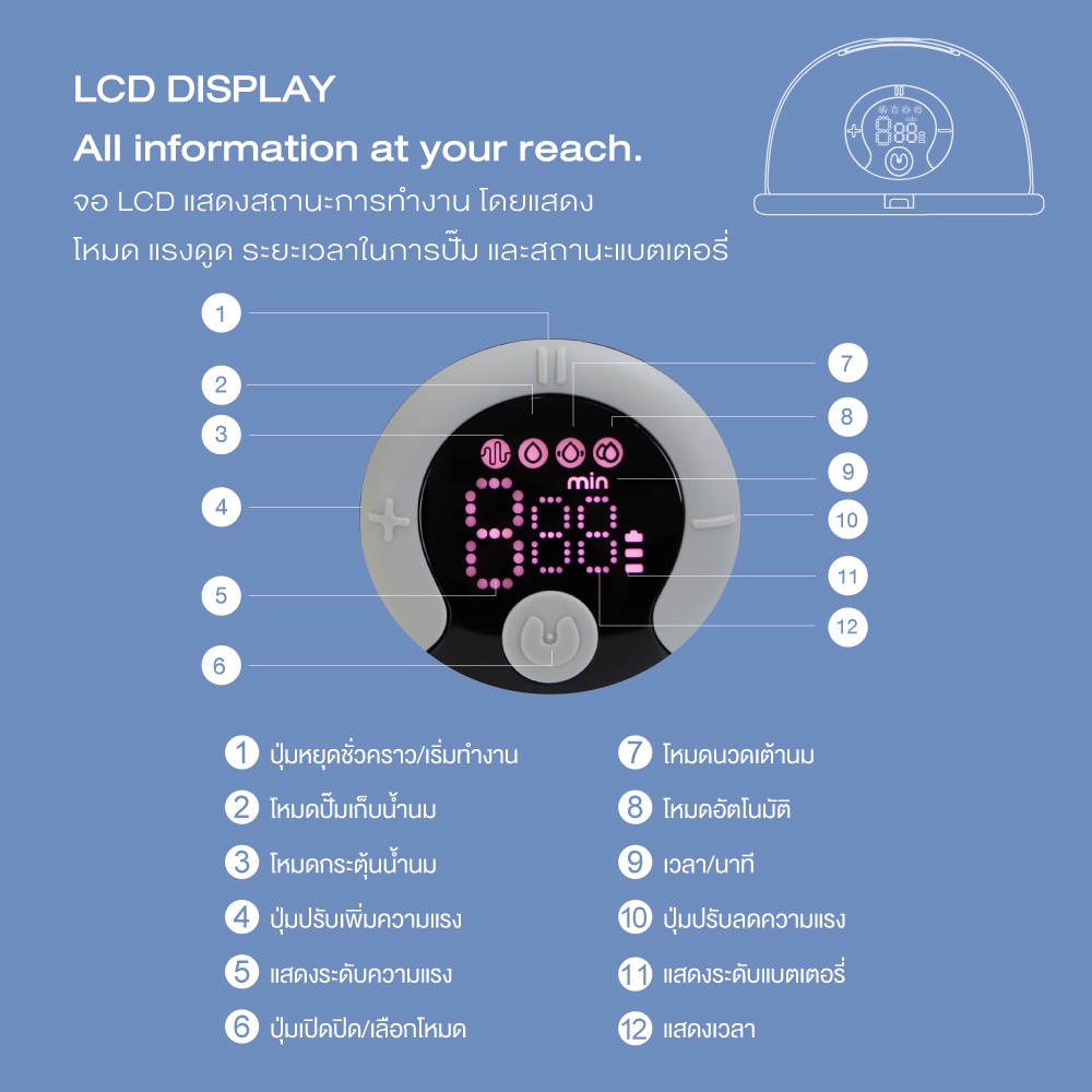 หน้าจอ LCD บอกสถานะโหมด ระดับแรงดูด และเวลาในการปั๊ม ทำให้คุณแม่รู้สถานะเครื่องได้อย่างชัดเจนโดยไม่ต้องหยุดกิจกรรม ขณะที่รีโมทคอนโทรลช่วยให้ควบคุมเครื่องได้โดยไม่ต้องเลื่อนเสื้อออกมา ช่วยเพิ่มความเป็นส่วนตัวและความสะดวกในการใช้งานในชีวิตประจำวัน
