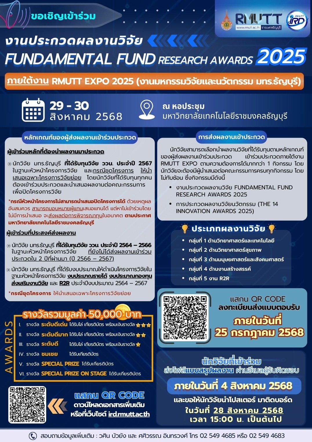 สถาบันวิจัยและพัฒนา มหาวิทยาลัยเทคโนโลยีราชมงคลธัญบุรี เปิดรับนักวิจัยเข้าร่วมประกวดผลงานวิจัยในเวที