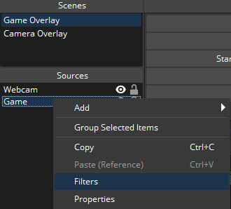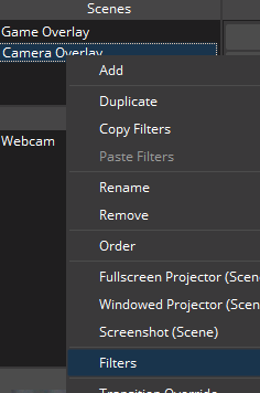 ที่ช่อง Scenes คลิกขวาที่ `Webcam Overlay` แล้วเลือก Filters