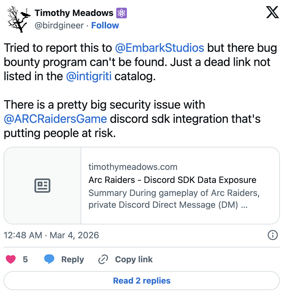 เกมยิงออนไลน์ ARC Raiders จากทีมพัฒนา Embark Studios เพิ่งปล่อยอัปเดตเร่งด่วนเพื่อแก้ปัญหาด้านความปลอดภัย หลังมีรายงานว่าระบบของเกมสามารถบันทึก ข้อความส่วนตัว (DM) จาก Discord ของผู้เล่น ลงในไฟล์ log ของเกมโดยไม่ได้ตั้งใจ