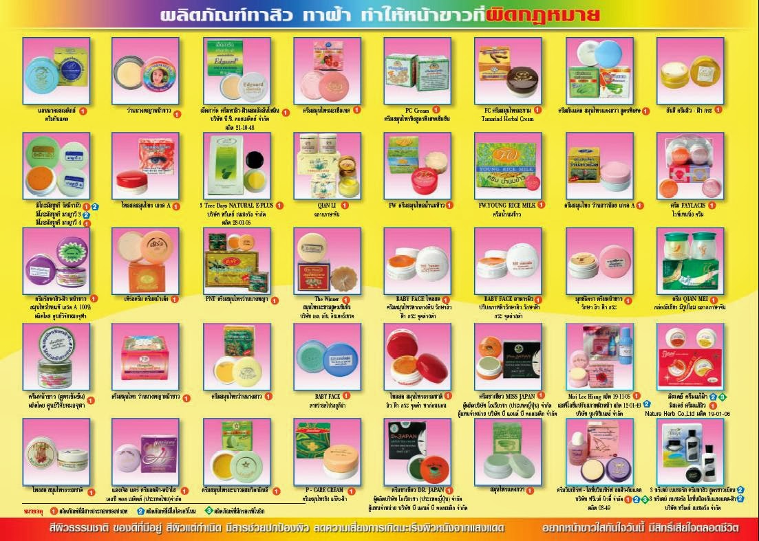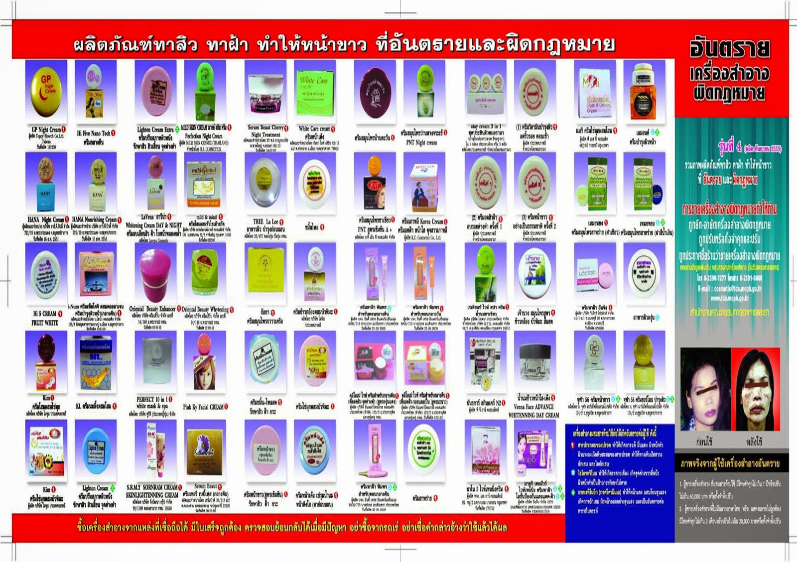 อย.ตรวจพบว่ามีเครื่องสำอางจำนวนมากผสมสารอันตรายที่ กฎหมายห้ามใช้ในเครื่องสำอาง ได้แก่