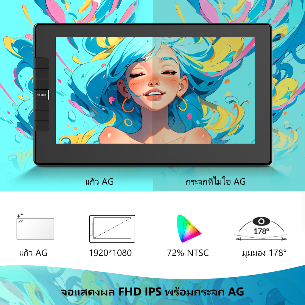 ส่วนจอแบบ Full Lamination คือการเคลือบกระจกและแผงภาพติดกันสนิท ทำให้ปากกากับภาพอยู่ระนาบเดียวกันจริง ๆ เส้นจึงตรงตำแหน่งแม่นขึ้น เหมาะมากสำหรับงานวาดเส้นหรือการลงรายละเอียด ซึ่ง VEIKK VK1200v2 ก็มาพร้อมเทคโนโลยีนี้แบบจัดเต็ม