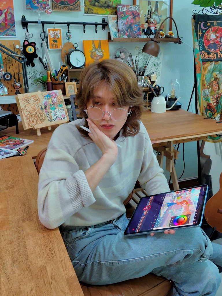 ทุกความอินในแต่ละช่วงชีวิตจะถูกกลั่นออกมาเป็นงานศิลปะเสมอ นั่นทำให้เขามุ่งตรงเข้าสู่การเรียนด้านศิลปะและการออกแบบดิจิทัล เพื่อเปิดพื้นที่ให้ตัวเองได้ลอง สไตล์ เทคนิค และวิธีเล่าเรื่อง ที่หลากหลาย ตรงกับความชอบของตัวเองมากที่สุด