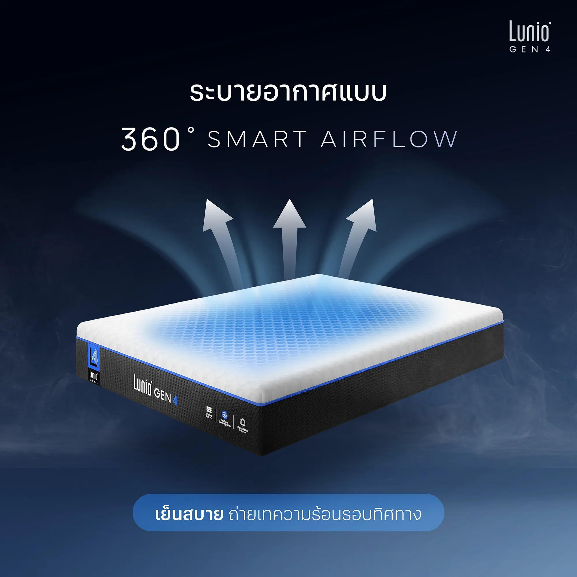 จุดขายสำคัญของ Lunio Gen4 คือการใช้ยางพาราเกรดพรีเมียม พร้อมการออกแบบให้ “ระบายอากาศได้ดี” และลดความร้อนขณะนอนหลับ โดยมีการสื่อสารว่าสามารถทำให้อุณหภูมิขณะนอน “เย็นลงประมาณ 2 องศา” (ตามคุณสมบัติที่ระบุ)