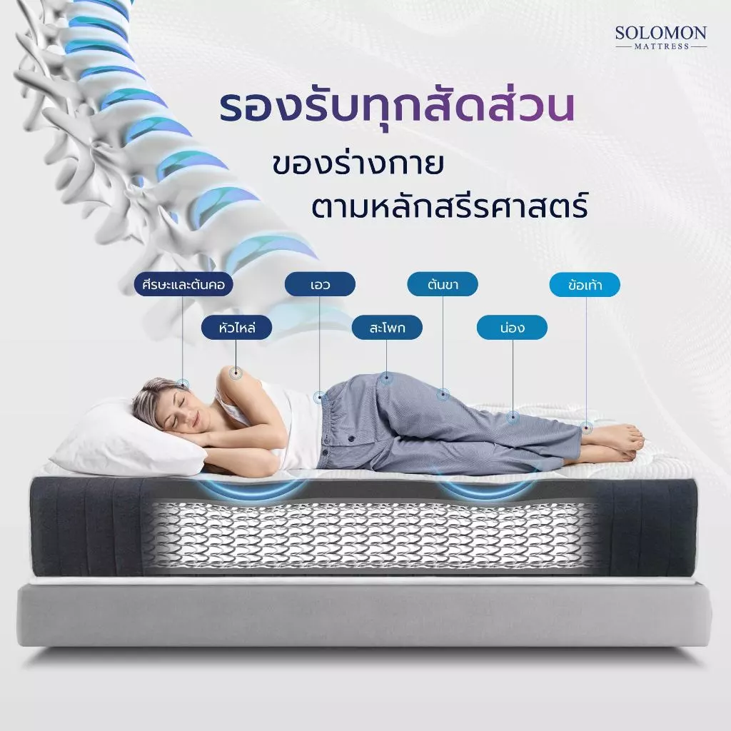 ระบบสปริงและโครงสร้างของที่นอนช่วยกระจายน้ำหนักของร่างกายอย่างสมดุล ช่วยให้แนวกระดูกสันหลังอยู่ในตำแหน่งที่เหมาะสม