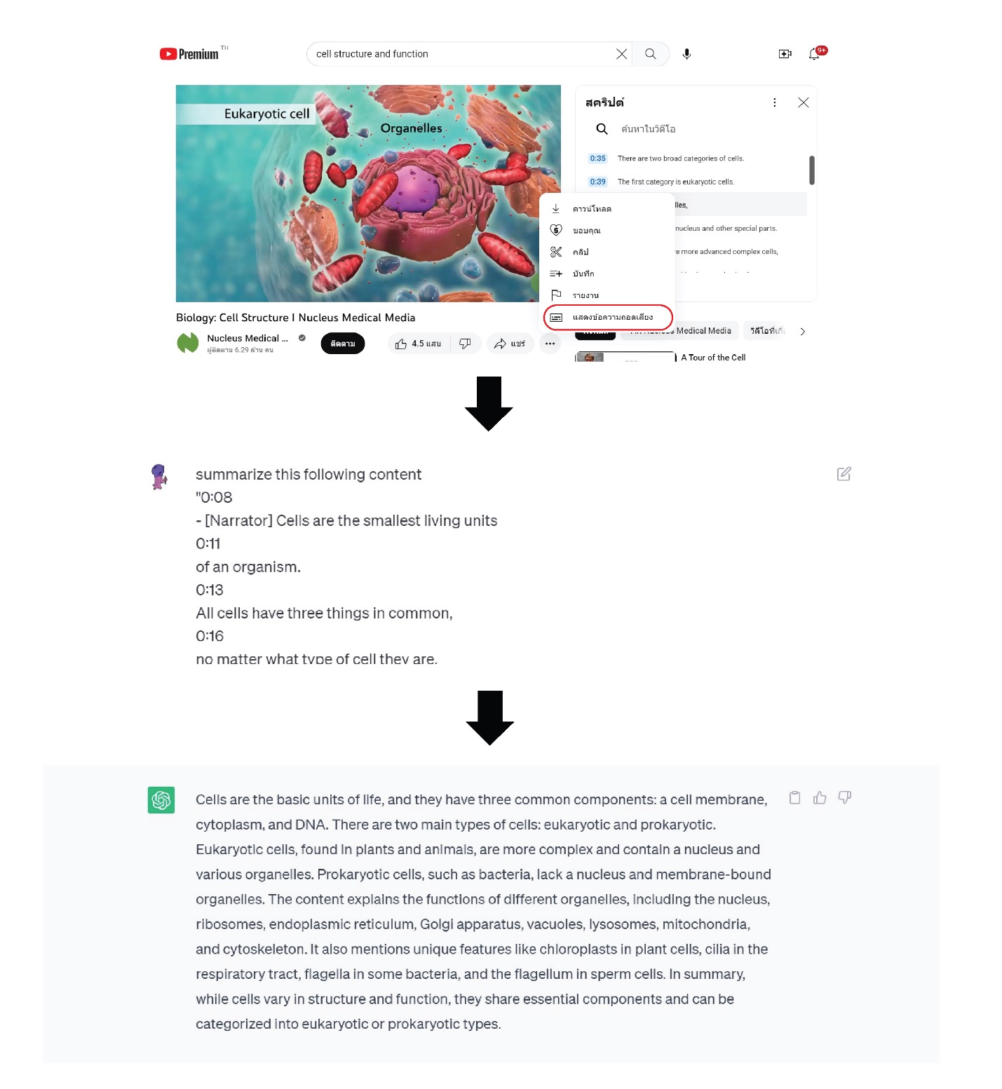 ตัวอย่างต่อไปนี้เป็นการใช้ ChatGPT เพื่อออกแบบการสอนเรื่อง โครงสร้างและหน้าที่ของเซลล์ สำหรับนักเรียนระดับมัธยมต้น โดยเน้นการใช้ Prompt ที่ชัดเจนและมีบริบทครบถ้วน