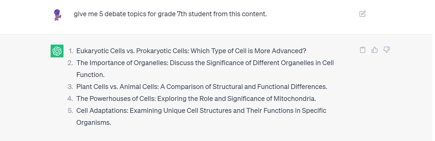 เมื่อมีเนื้อหาพื้นฐานแล้ว ครูอาจอยากชวนนักเรียนคิดลึกขึ้นผ่านการอภิปรายหรือดีเบตในห้องเรียน ก็สามารถให้ ChatGPT ช่วยคิดคำถามเชิงวิเคราะห์ให้ได้