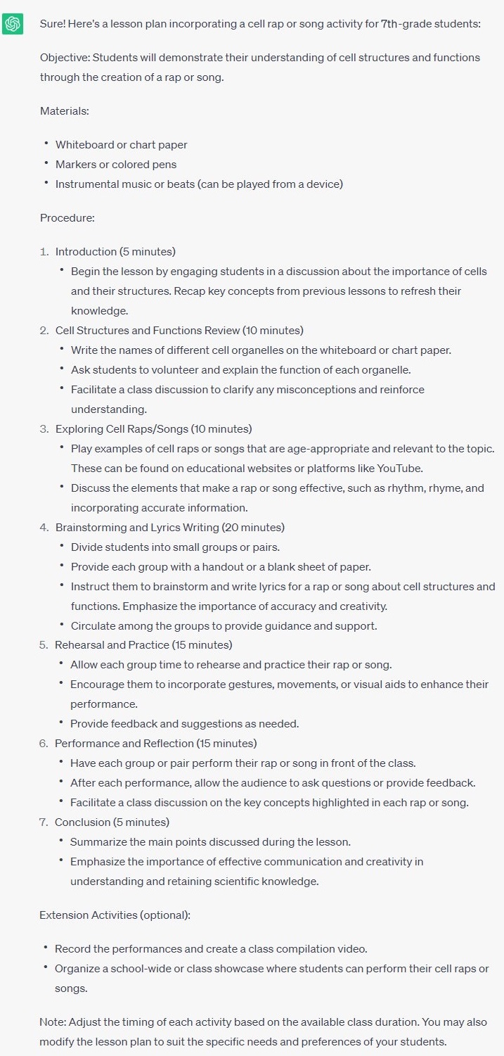 ตัวอย่างเช่น หากครูเลือกใช้กิจกรรม แต่งเพลงหรือแร็พเรื่องเซลล์ ก็สามารถให้ ChatGPT ช่วยร่างแผนการสอนได้ โดยระบุรายละเอียดใน Prompt ให้ชัด เช่น
