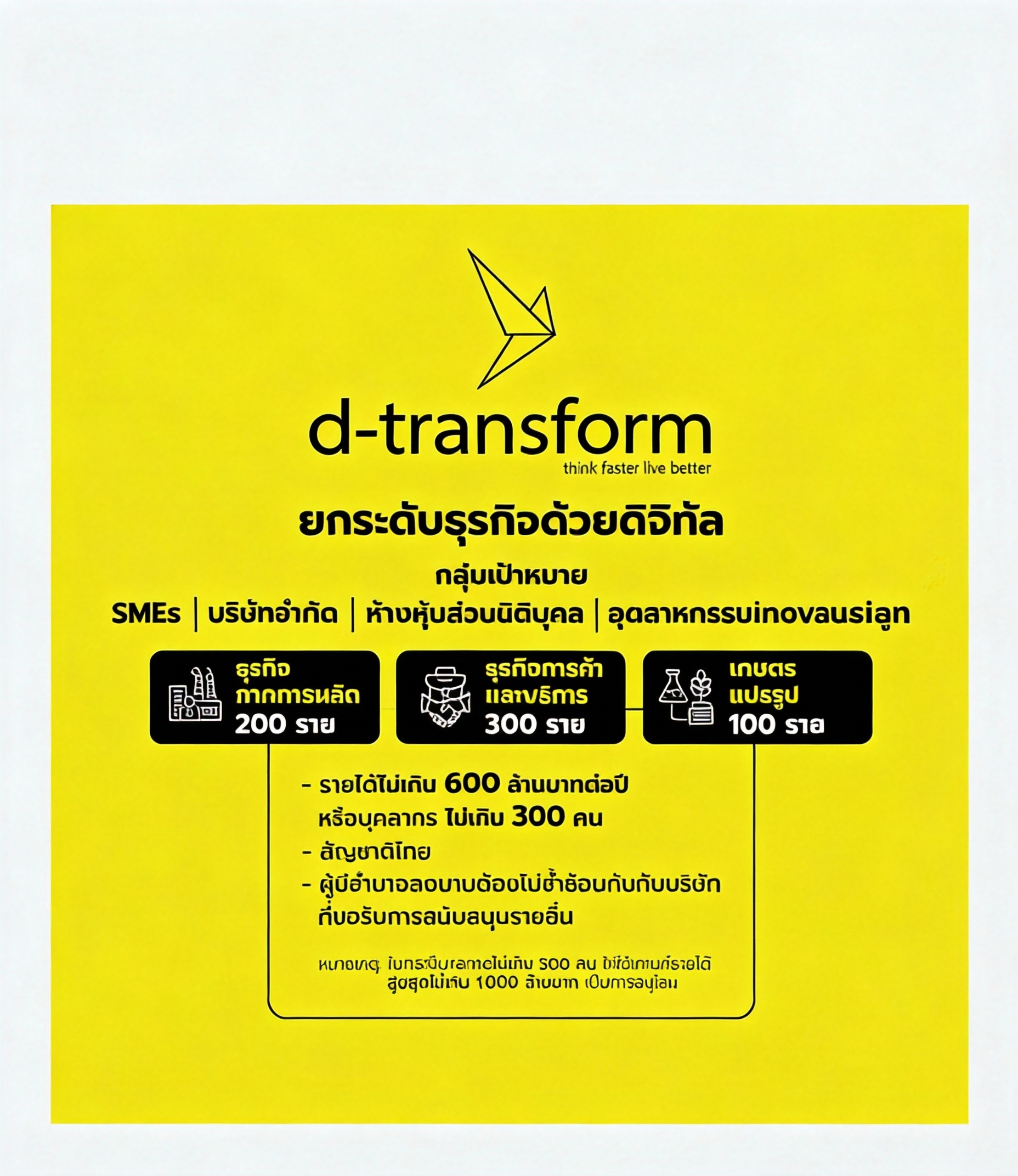 D‑transform – เน้นช่วยให้ธุรกิจยกระดับทั้งระบบ โดยให้เงินสนับสนุนสูงสุด 200,000 บาท สำหรับ SMEs บางกลุ่มที่เข้าเกณฑ์