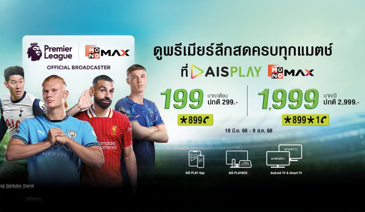 สำหรับรายเดือน: แจ้งเริ่มใช้งานแพ็กเกจ PLAY MONOMAX Standard ราคา 199 บาท/เดือน (รวม VAT) ดูพรีเมียร์ลีกสดครบทุกแมตช์ผ่าน AIS PLAY และรับสิทธิ์ดูหนัง–ซีรีส์ดังผ่าน MONOMAX
