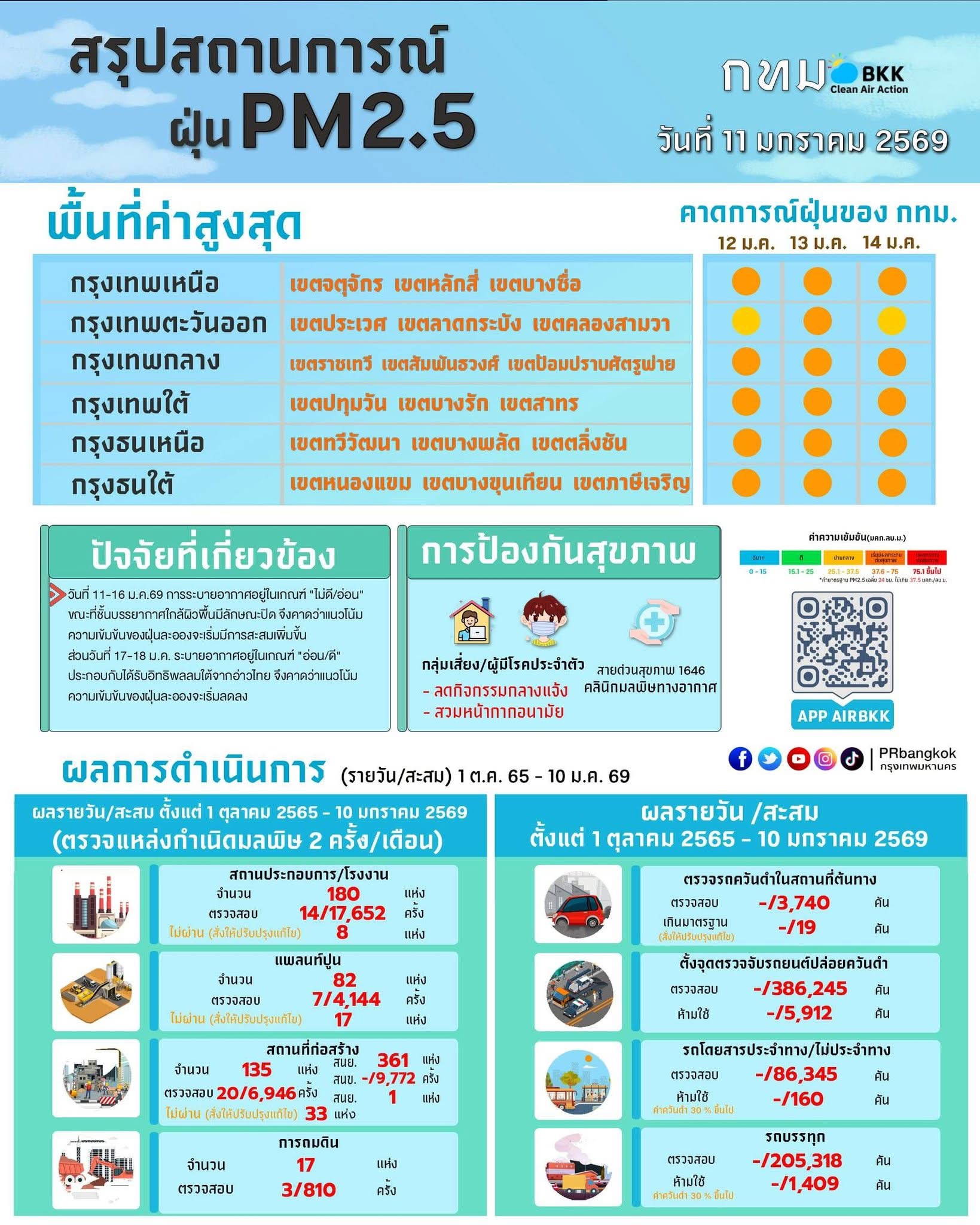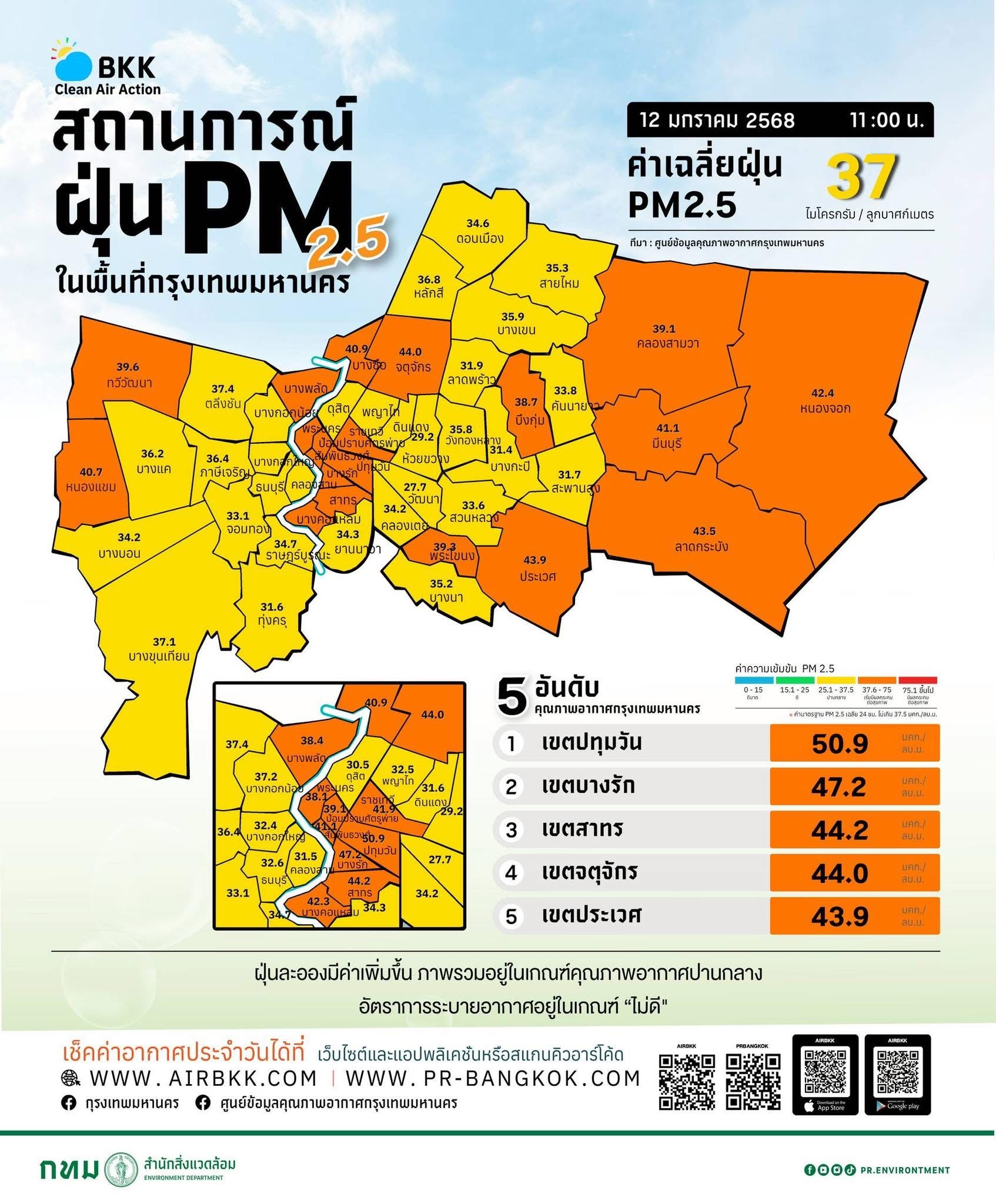 กรุงเทพมหานครและปริมณฑลตกอยู่ในสภาวะ "จมฝุ่น" อีกครั้งในวันนี้ (12 มกราคม 2569) เมื่อศูนย์ข้อมูลคุณภาพอากาศกรุงเทพมหานคร และกรมควบคุมมลพิษ รายงานค่าฝุ่นละออง PM 2.5 พุ่งสูงเกินมาตรฐานในหลายพื้นที่ โดยเฉพาะในเขตกทม. ที่มีพื้นที่ระดับ "สีส้ม" (เริ่มมีผลกระทบต่อสุขภาพ) กระจายตัวเป็นวงกว้าง