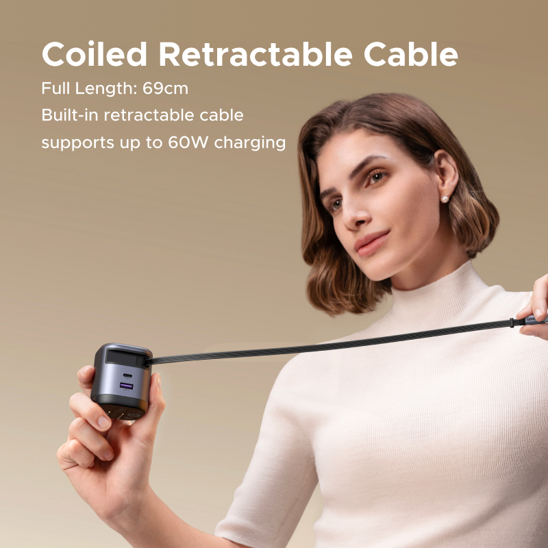 รุ่นนี้มาพร้อม สาย USB Type-C แบบพับเก็บได้ในตัว ทำให้ไม่ต้องพกสายชาร์จเพิ่ม เหมาะกับการใช้งานนอกสถานที่ การเดินทาง หรือโต๊ะทำงานที่ต้องการความเป็นระเบียบ