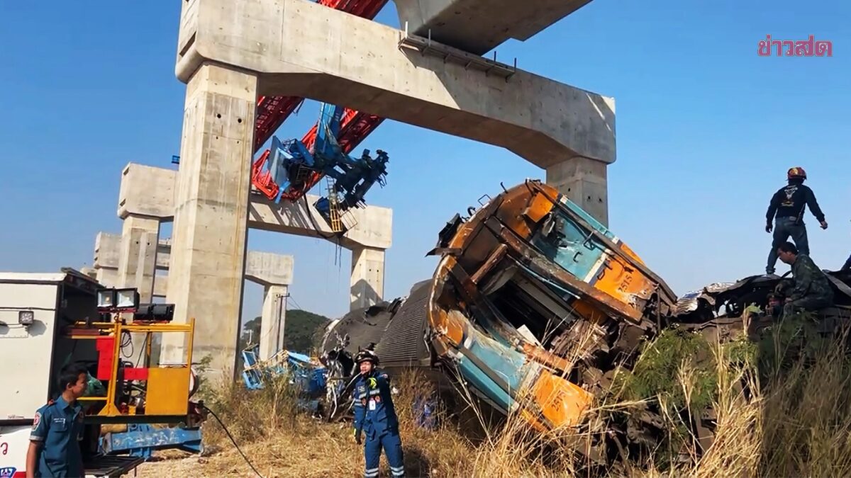 นครราชสีมา (14 มกราคม 2569) – เกิดเหตุโศกนาฏกรรมครั้งใหญ่ในโครงการก่อสร้างรถไฟความเร็วสูง เมื่อเครนยกสะพานเหล็กขนาดมหึมาพังถล่มลงมาทับขบวนรถไฟด่วนพิเศษที่กำลังวิ่งผ่าน ส่งผลให้มีผู้เสียชีวิตล่าสุดพุ่งสูงถึง 30 ราย และบาดเจ็บอีกกว่า 60 ราย เจ้าหน้าที่ต้องสั่งระงับการค้นหาชั่วคราวหลังโครงสร้างส่งสัญญาณอันตราย