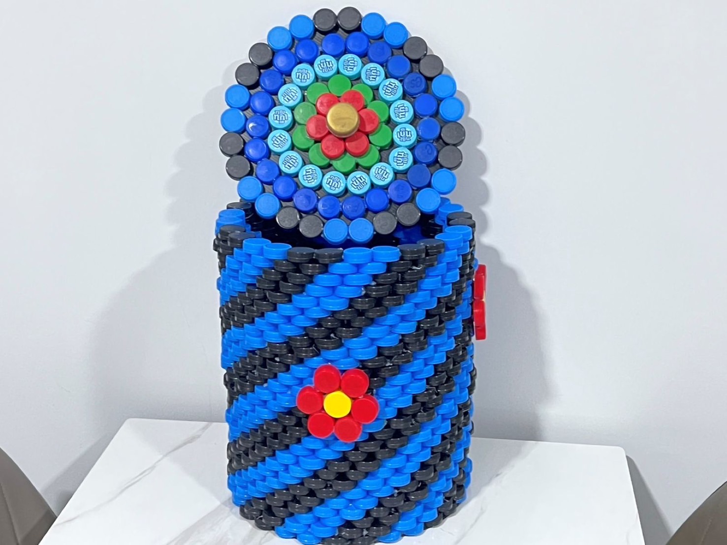 จึงนำความรู้จากโครงการ “แยกขวดช่วยน้อง” มาต่อยอดเป็นไอเดียประดิษฐ์สิ่งของจากวัสดุรีไซเคิล จนกลายมาเป็น ถังรักษ์โลกจากฝาขวด ที่ทั้งสวย ใช้ได้จริง และให้คุณค่าทางใจ