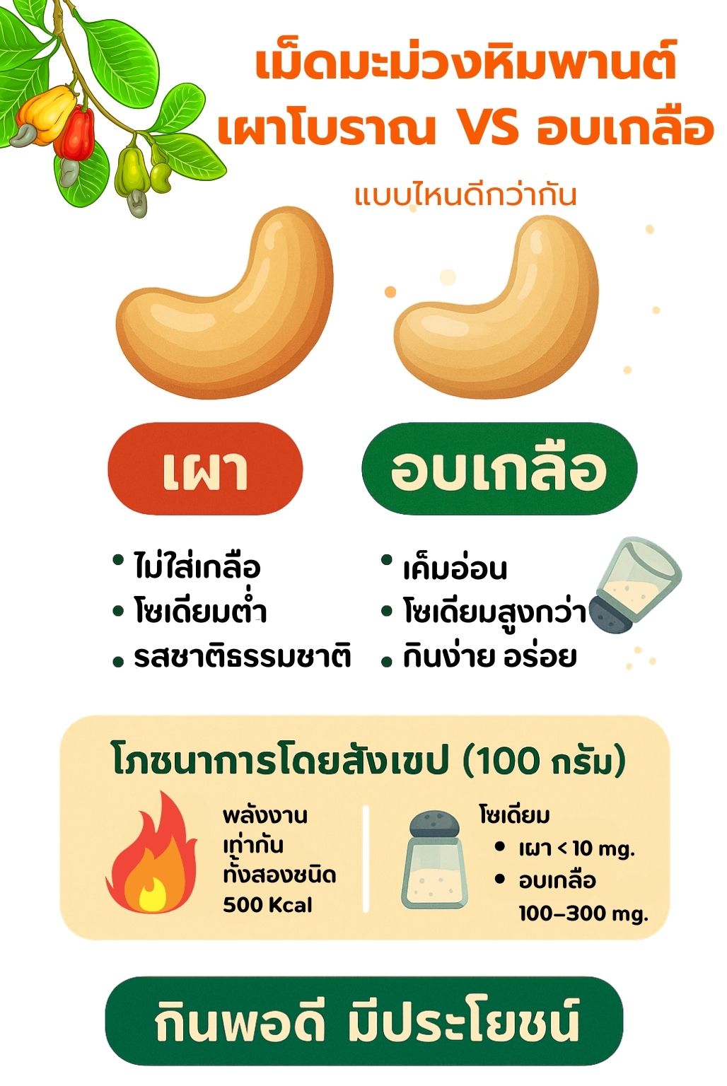 เมื่อดูภาพรวมด้านโภชนาการแล้ว เม็ดมะม่วงหิมพานต์ทั้งสองแบบยังคงเป็นแหล่ง ไขมันดีและพลังงานคุณภาพสูง เหมือนกัน แต่ต่างกันในรายละเอียดเล็กๆ ที่มีผลกับสุขภาพในระยะยาว