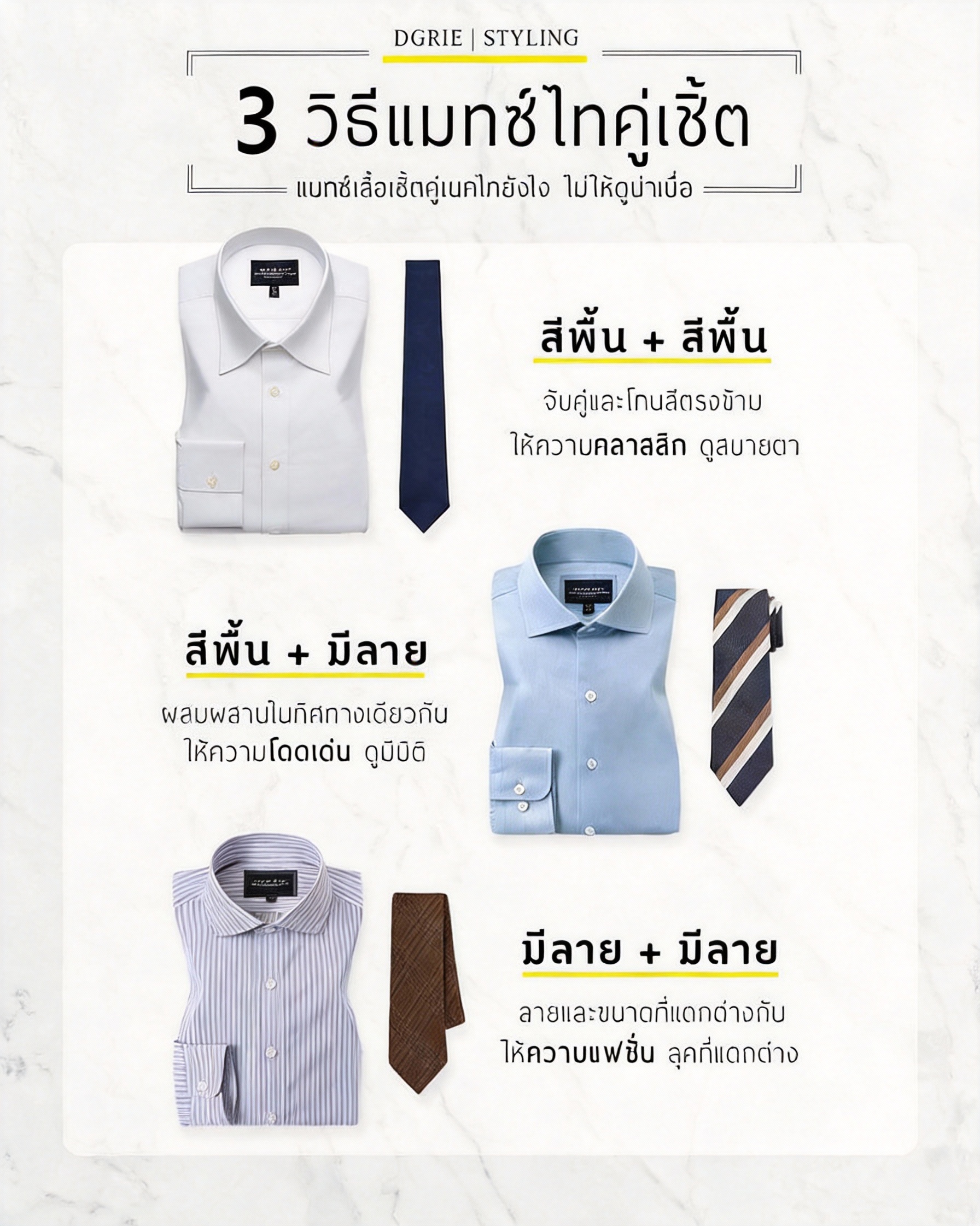 เลือกประเภทลายหรือรูปแบบลาย ให้ต่างกัน เช่น เชิ้ตลายทาง + เนคไทลายจุด