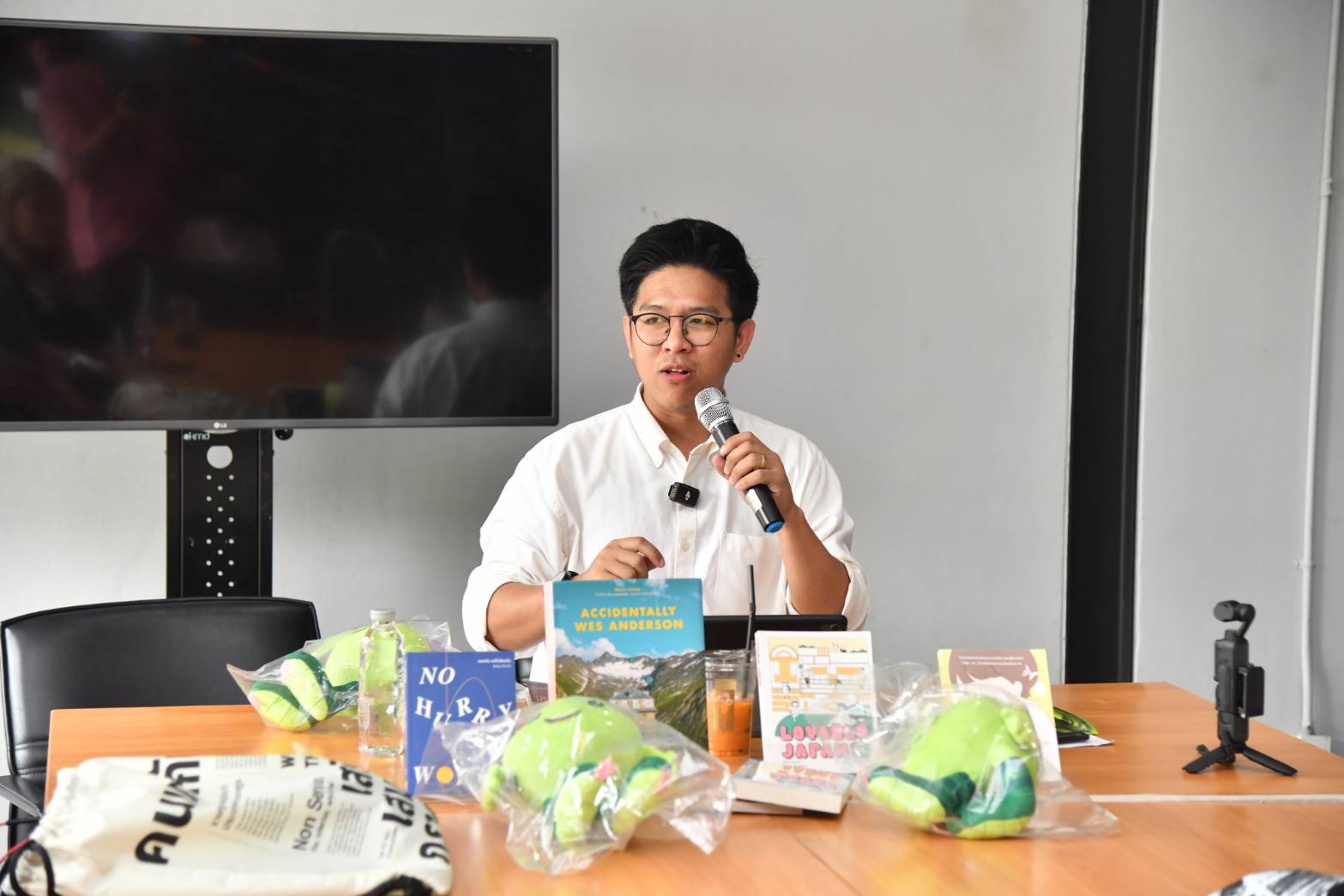 วิทยากรบนเวทีคือ อาทิตย์ ธรรมชาติ บรรณาธิการและเจ้าของร้านหนังสือ @arthittime.bookshop ที่ไม่ได้มาแค่พูดคุย แต่ขนลิสต์หนังสืออุ่นหัวใจมา “ป้ายยา” กันแบบจัดเต็ม