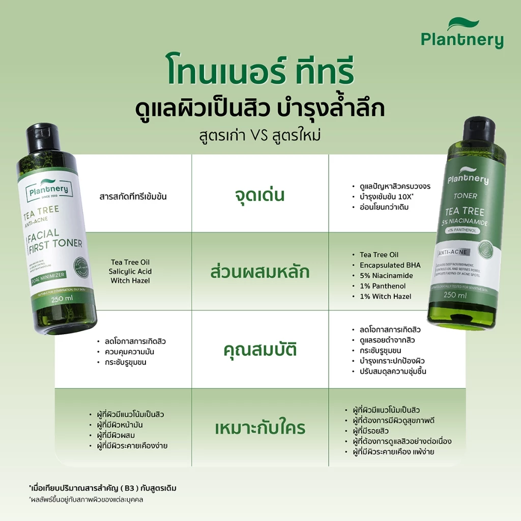 Plantnery Tea Tree First Toner สูตรใหม่ เป็นโทนเนอร์สำหรับผิวเป็นสิวที่รวมทั้งสารสกัดธรรมชาติอย่าง Organic Tea Tree และส่วนผสมเชิงวิทยาศาสตร์อย่าง Niacinamide, Encapsulated BHA และ Panthenol