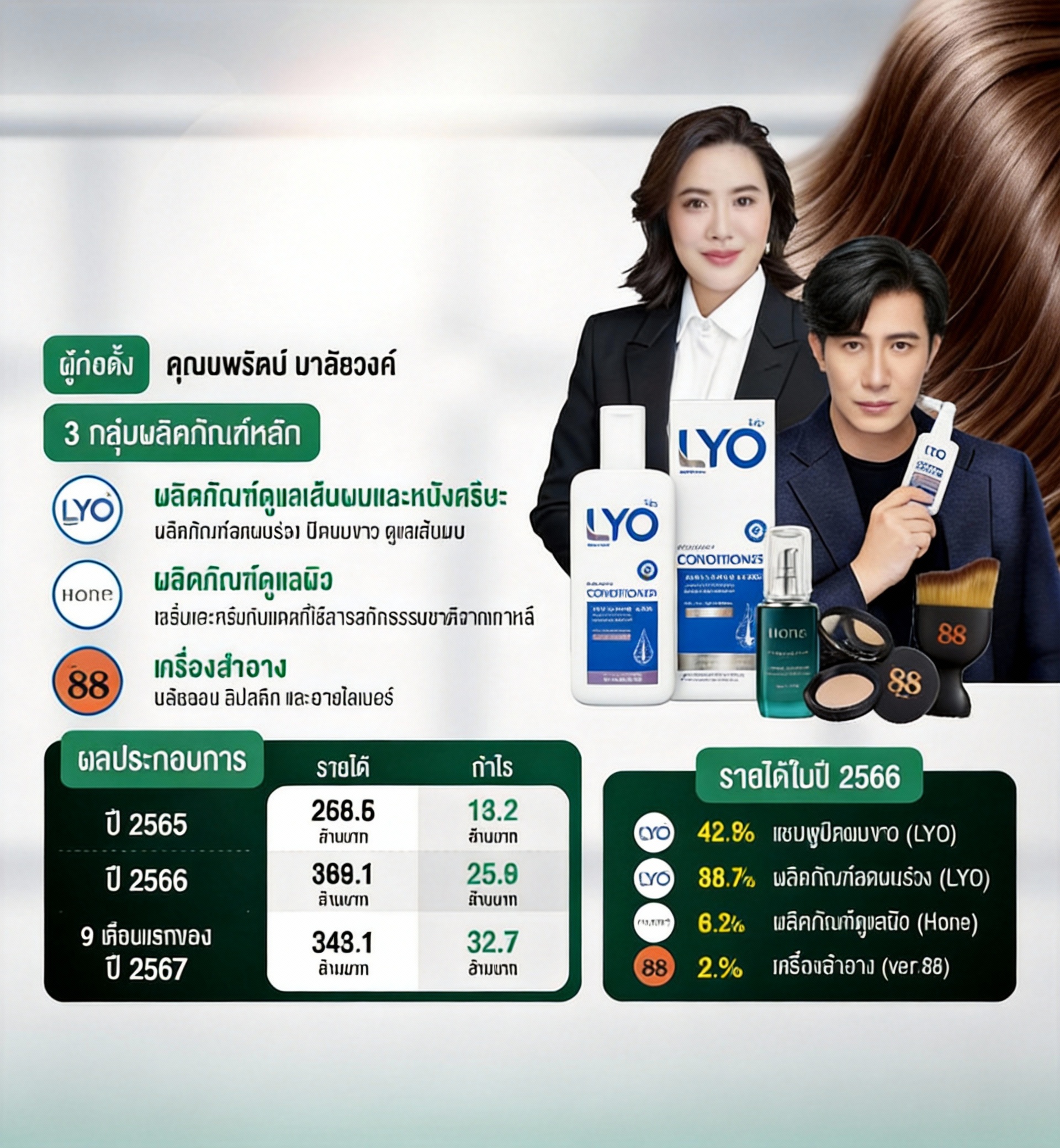 จุดเด่นชัด ๆ คือ รายได้กว่า 90% ของบริษัท มาจากแบรนด์ LYO โดยเฉพาะผลิตภัณฑ์ ลดผมร่วง และ แชมพูปิดผมขาว ที่กลายเป็นสินค้าหลักในใจผู้บริโภค
