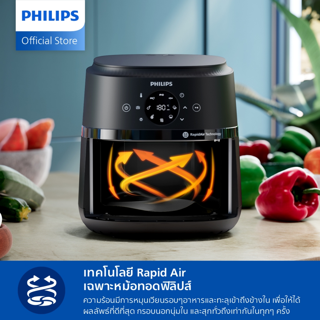 RapidAir เป็นเทคโนโลยีเฉพาะของ Philips ที่ออกแบบการไหลเวียนลมร้อนให้หมุนเวียนอย่างทั่วถึงรอบอาหาร