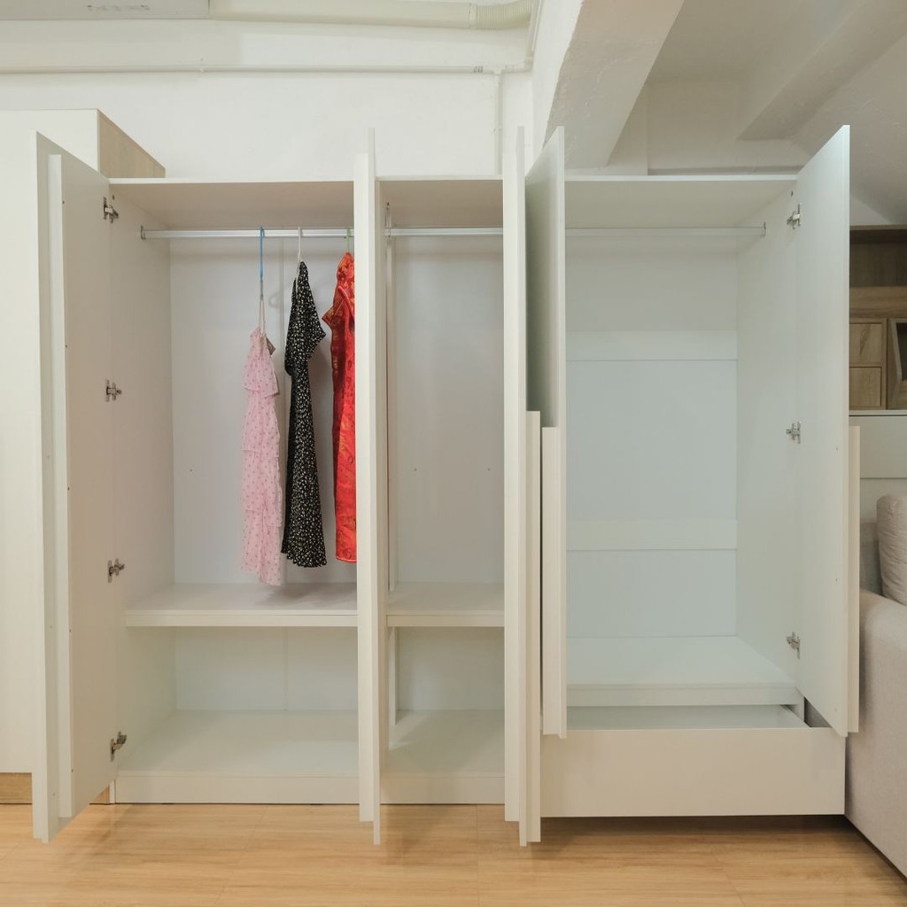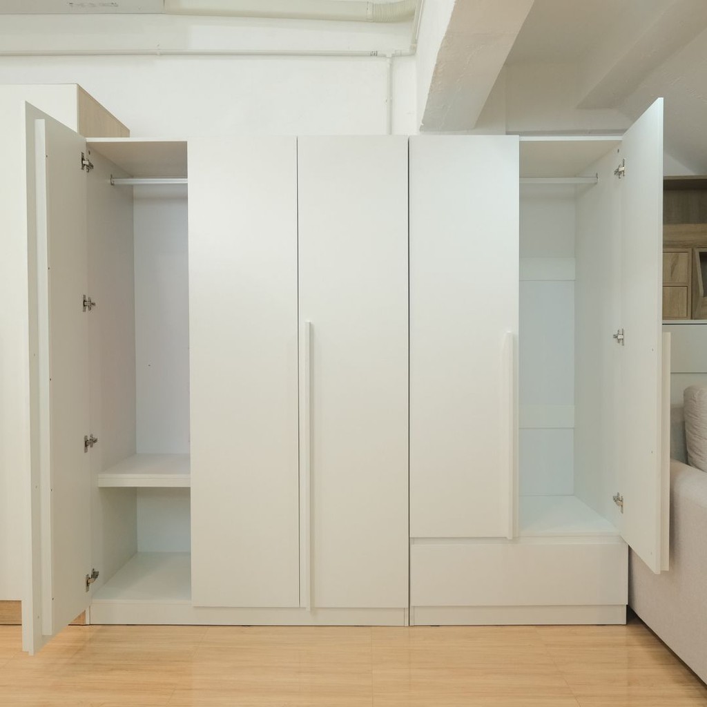 ภายในมี ชั้นวางแบ่งหลายระดับ เก็บเสื้อผ้าได้หลากหลายหมวด เช่น เสื้อพับ ชุดทำงาน ผ้าปูที่นอน หรือของใช้ระยะยาว