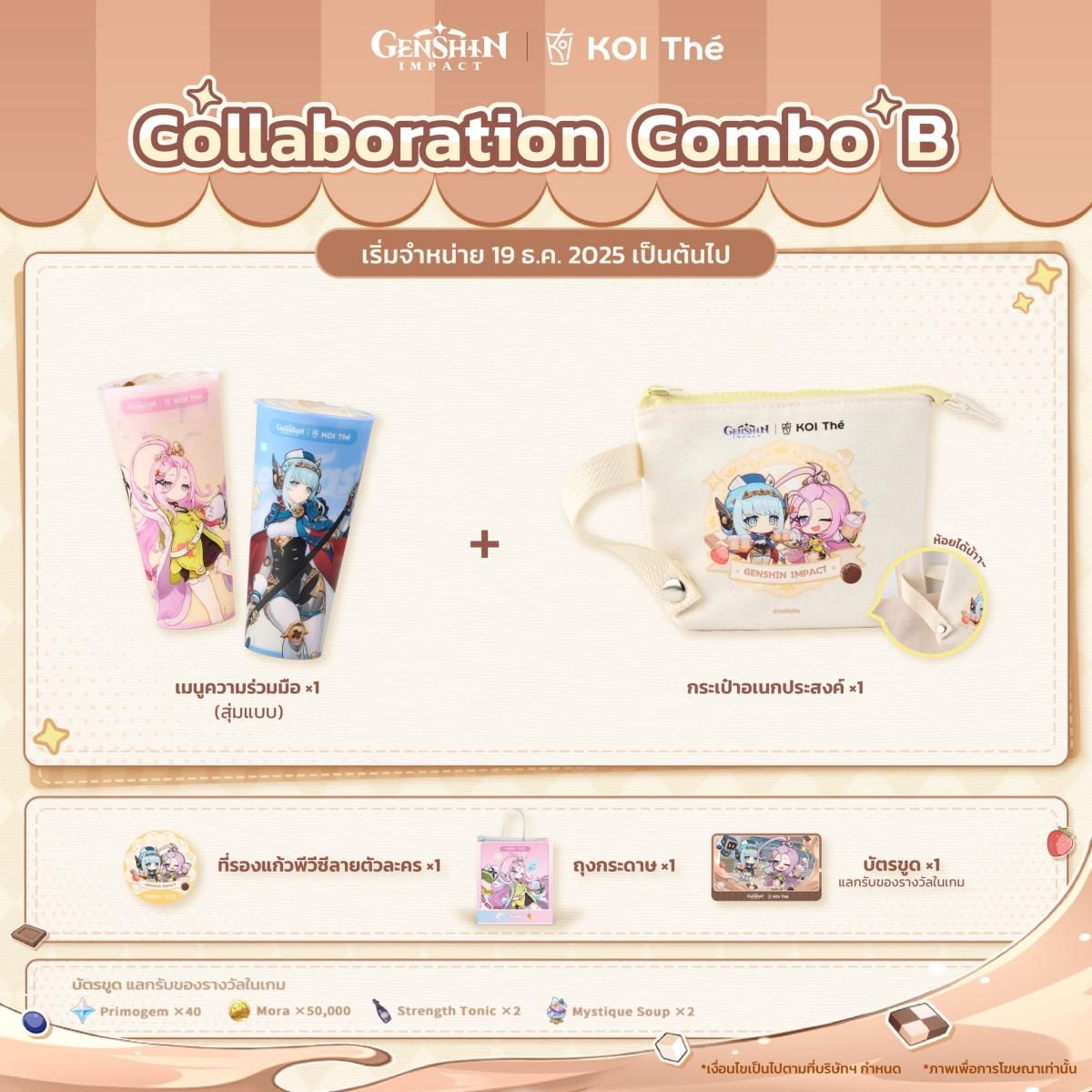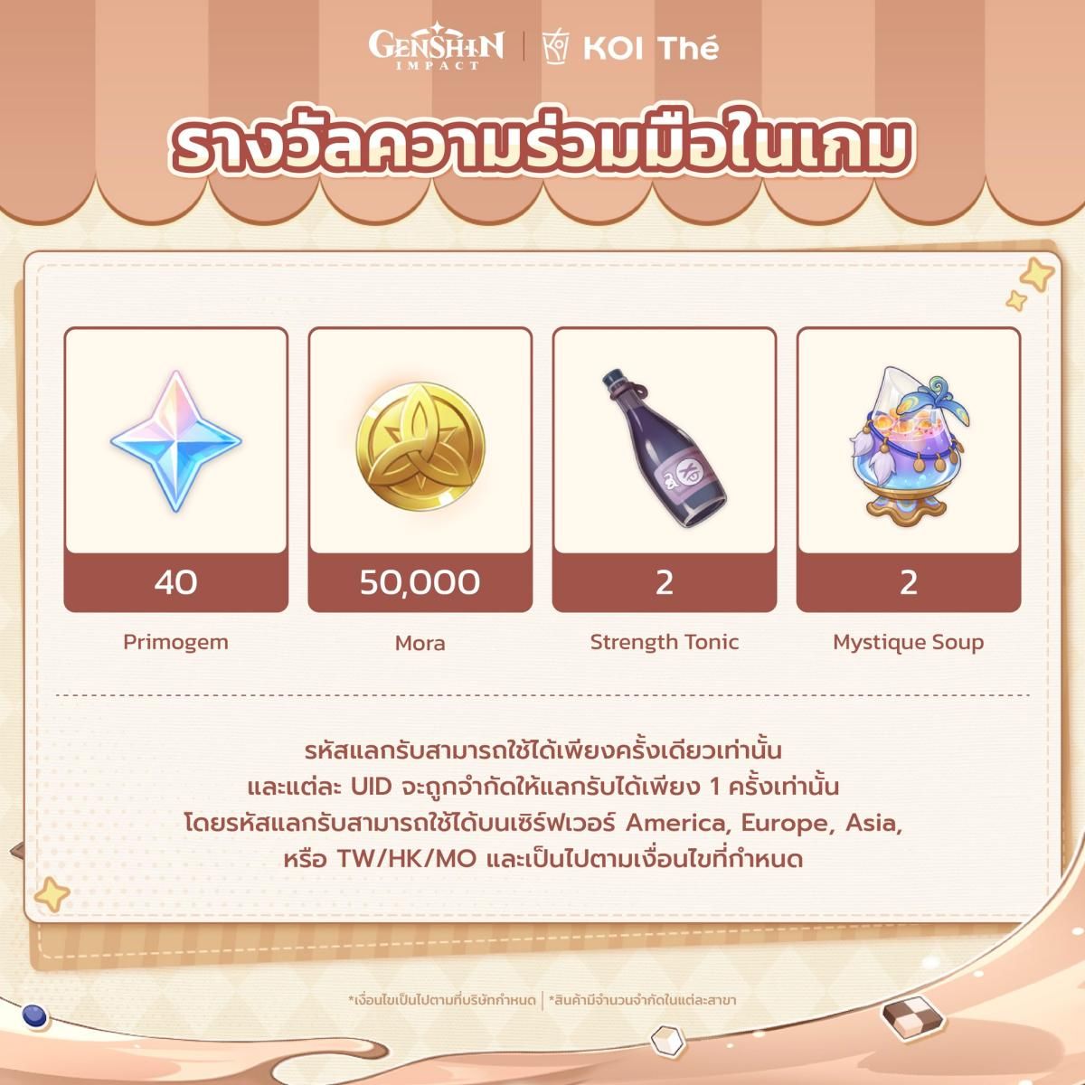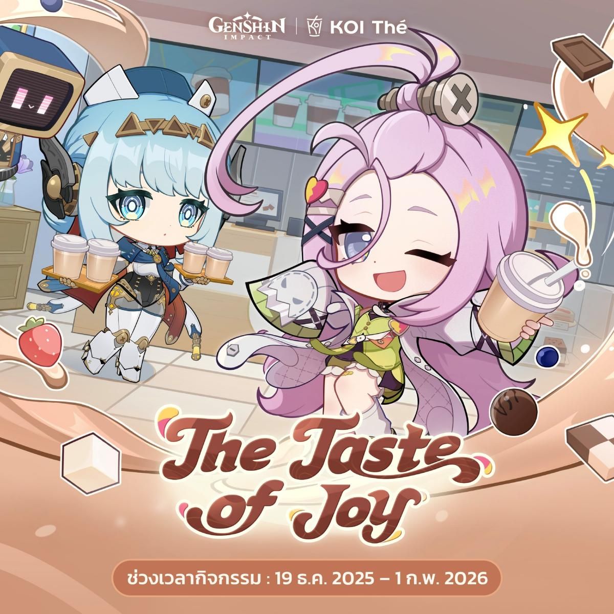 Genshin Impact x KOI Thé คือกิจกรรมความร่วมมือระหว่างเกม Genshin Impact จาก HoYoverse และแบรนด์ชาชื่อดัง KOI Thé ภายใต้คอนเซปต์ “The Taste of Joy” ซึ่งถูกออกแบบมาเพื่อมอบประสบการณ์นอกเกมให้กับผู้เล่น ผ่านเครื่องดื่ม เมอร์ช และรางวัลในเกม
