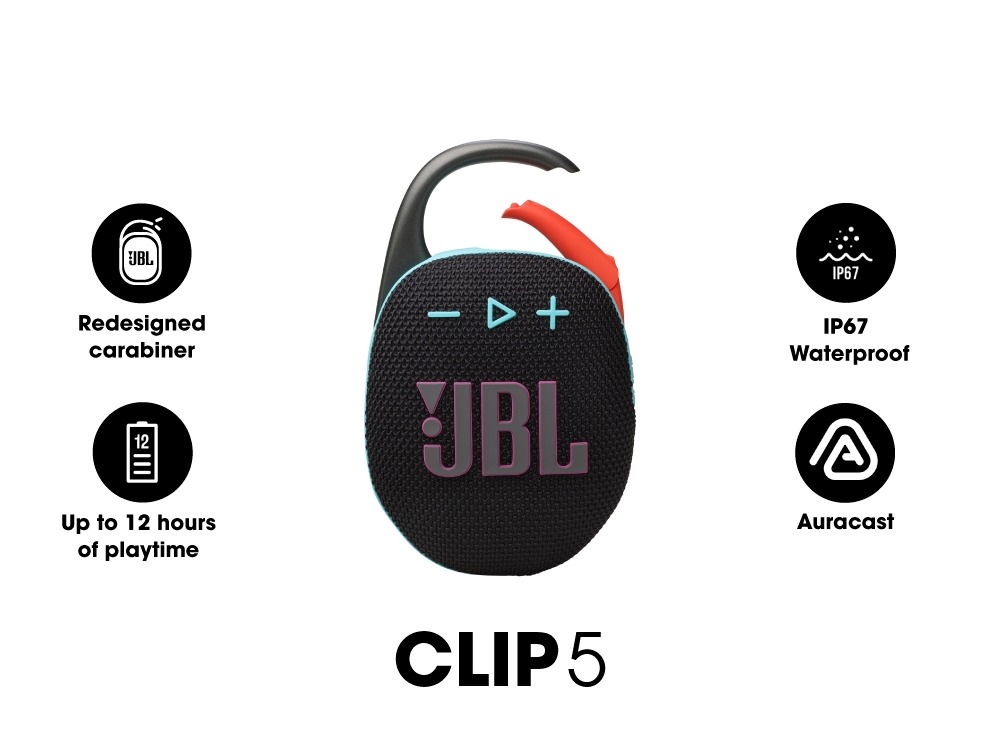 JBL CLIP 5 เป็นลำโพง Bluetooth แบบพกพารุ่นล่าสุดในตระกูล CLIP ที่เน้นความเล็ก เบา แข็งแรง และให้คุณภาพเสียงเกินขนาดตัว ลำโพงรุ่นนี้มาพร้อมตะขอคล้องในตัว (Built-in Carabiner) ทำให้สามารถคล้องกับกระเป๋า เป้ เข็มขัด หรืออุปกรณ์ต่าง ๆ ได้ทันที เหมาะกับการใช้งานทั้งในชีวิตประจำวันและกิจกรรมกลางแจ้ง