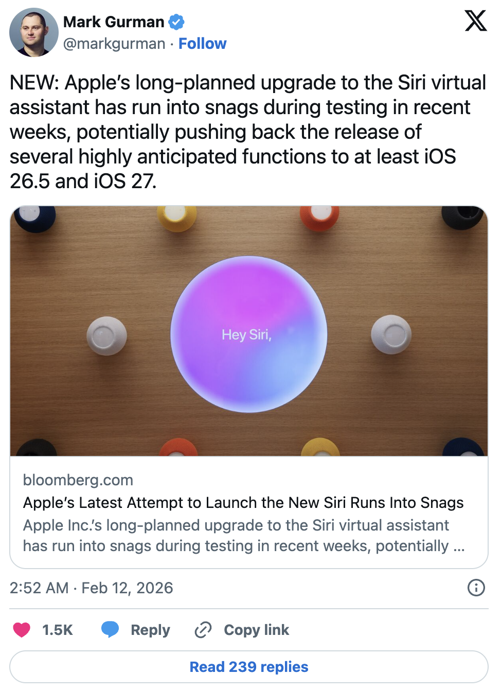 ก่อนหน้านี้มีรายงานว่า Siri โฉมใหม่จะเปิดตัวช่วงครึ่งหลังของเดือนกุมภาพันธ์ โดยมีการระบุวันที่ 23 กุมภาพันธ์เป็นเป้าหมาย
