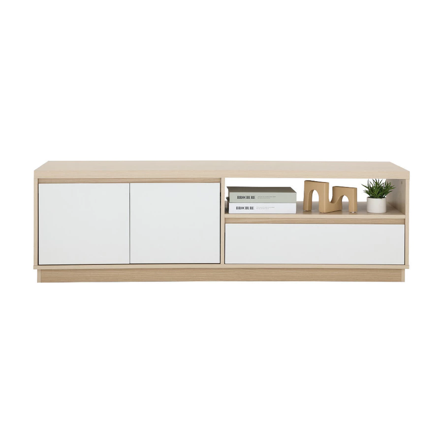 Furinbox รุ่นมินิโอ มาในขนาด 150 ซม. ซึ่งเหมาะกับทีวีประมาณ 55–65 นิ้ว ดีไซน์เน้นความเรียบง่ายสไตล์โมเดิร์น มี 2 บานเปิดด้านข้าง และลิ้นชักตรงกลาง