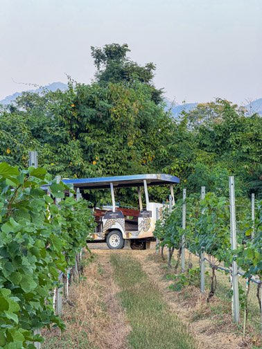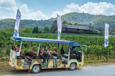 นั่งรถชมไร่องุ่นแบบใกล้ชิด แล้วลงมือเก็บองุ่นสดจากต้นด้วยตัวเอง เป็นประสบการณ์ที่ทั้งได้รูปและได้ความทรงจำย่ำองุ่นและผสมไวน์