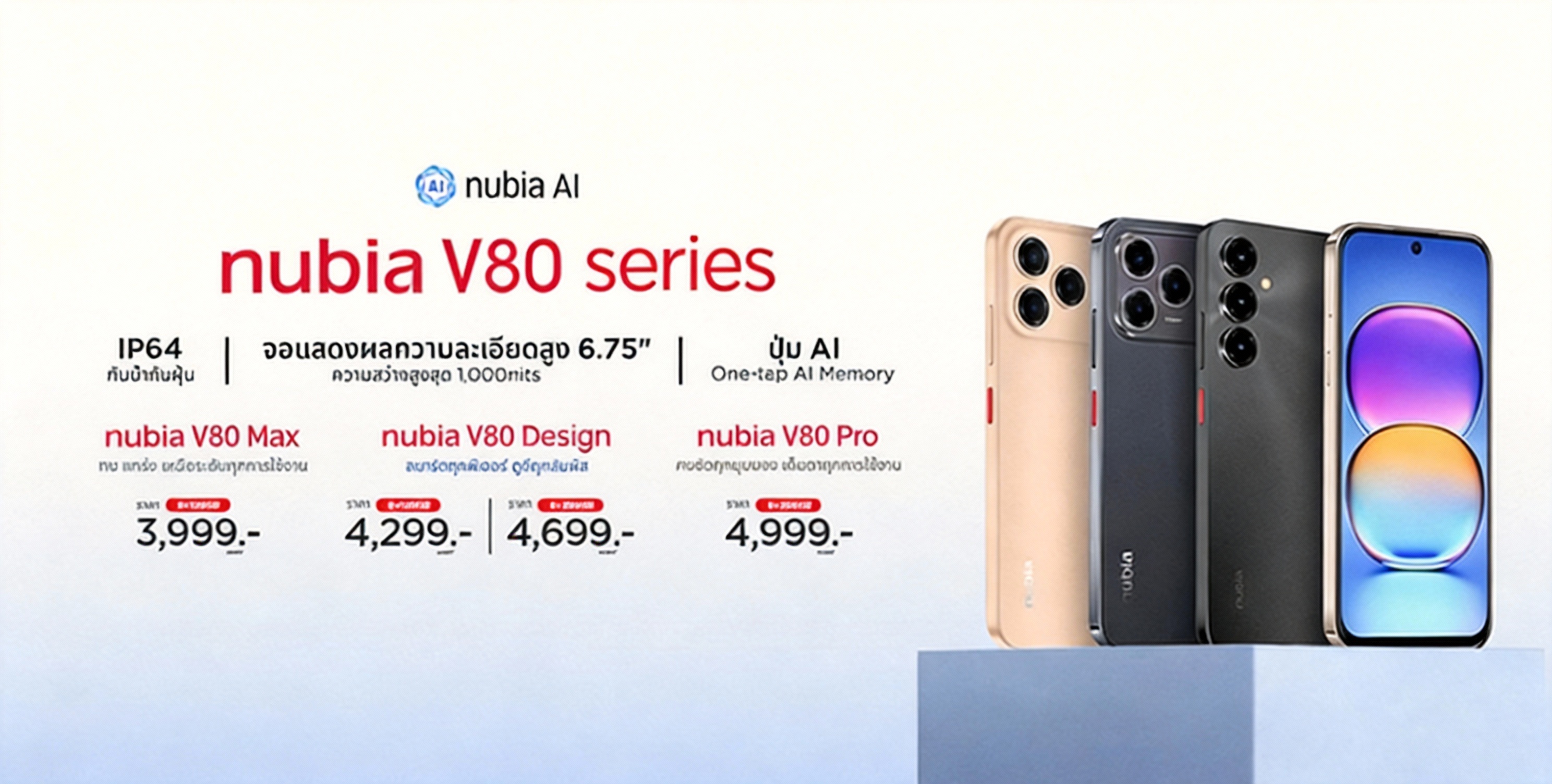 nubia แบรนด์สมาร์ตโฟนระดับโลก เดินเกมรุกตลาดไทยด้วยการเปิดตัว nubia V80 Series อย่างเป็นทางการ ส่งมาแบบครบเซ็ต 3 รุ่นคือ V80 Pro, V80 Design และ V80 Max