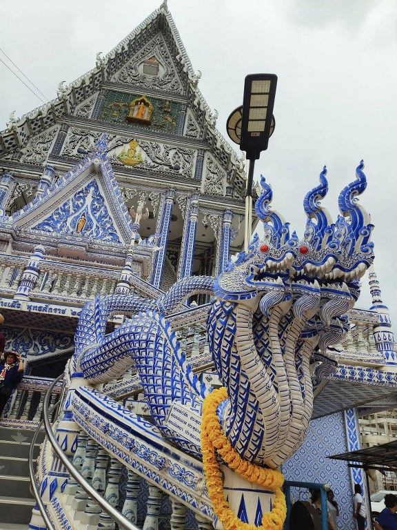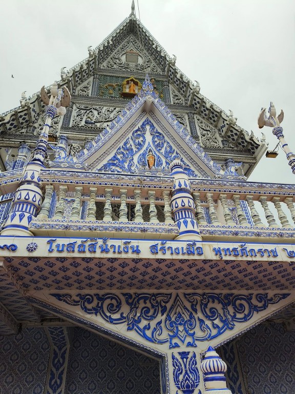 อีกจุดที่สวยแปลกตาจนต้องยกกล้องขึ้นถ่ายคือ วัดสีน้ำเงิน หรือ วัดปากน้ำแขมหนู วัดริมทะเลที่ใช้กระเบื้องเซรามิกสีน้ำเงิน–ขาวตกแต่งทั้งโบสถ์
