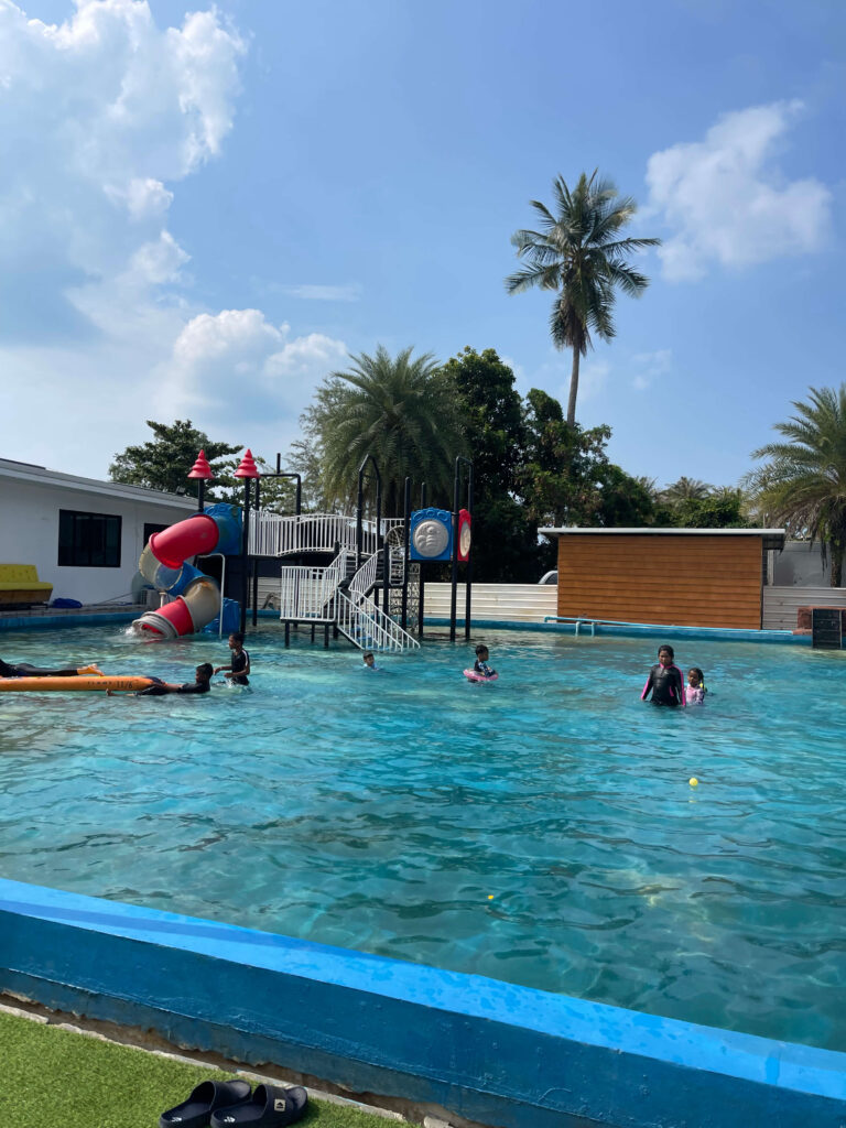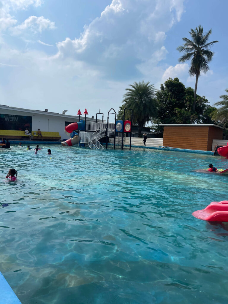 มุมริมสระสีสันสดใสกับสไลเดอร์ด้านหลัง เด็กๆ ยืนโพสทีแสงกระทบสระน้ำคือสวยมาก