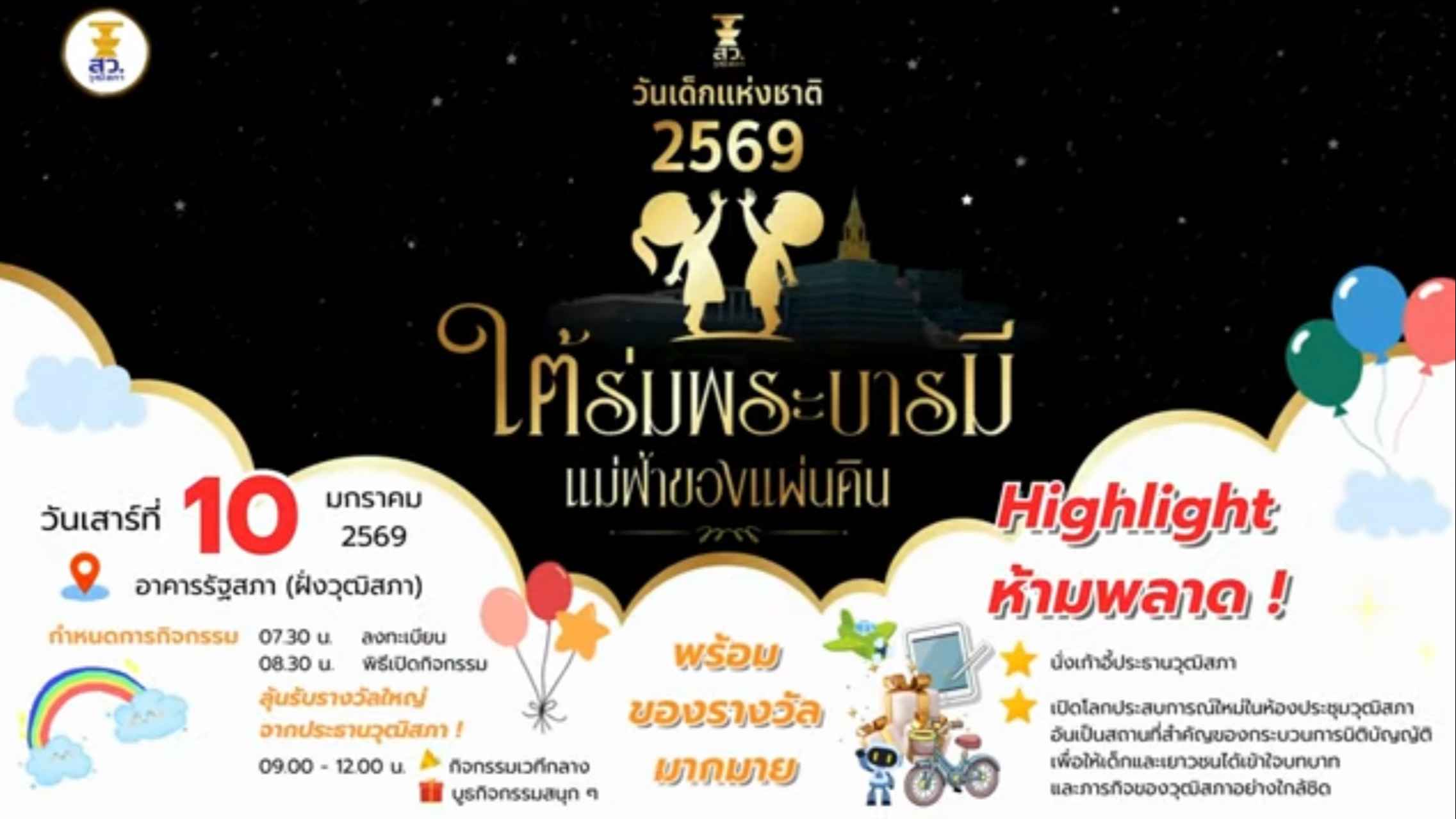 วันเสาร์ที่ 10 มกราคม 2569 นี้ วุฒิสภาเปิดประตูรัฐสภา (ฝั่งวุฒิสภา) ต้อนรับเด็กและเยาวชนในงานวันเด็กแห่งชาติ ช่วงเวลา 08.30–12.00 น.