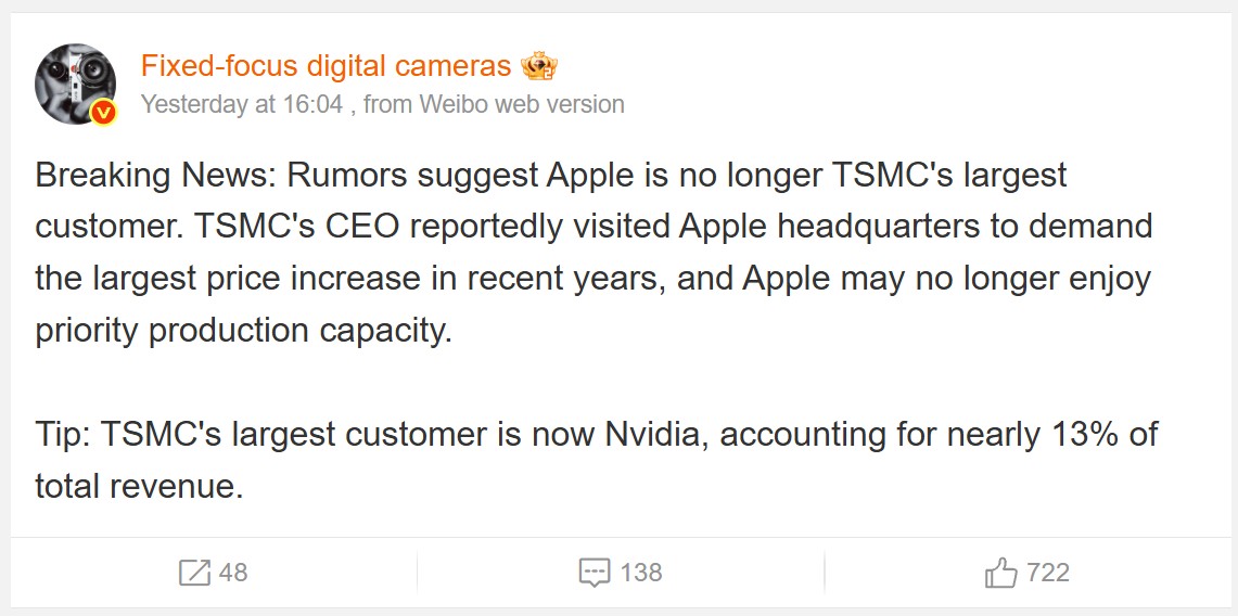 แต่ในเชิงรายได้รวม Apple ไม่ใช่ลูกค้ารายใหญ่ที่สุดของ TSMC อีกต่อไปแล้ว