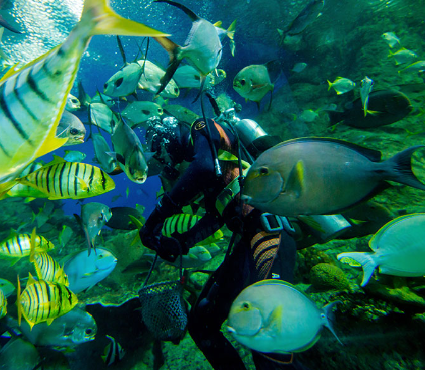 ยังมีโชว์ให้อาหารสัตว์น้ำ โดยนักประดาน้ำจะลงไปให้อาหารต่อหน้าแบบระยะประชิด ทั้งลุ้น ทั้งได้ความรู้ไปพร้อมกัน