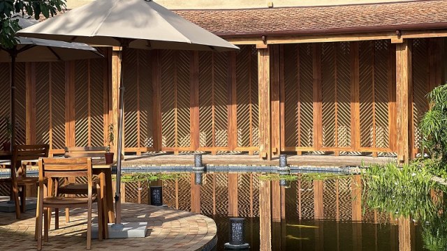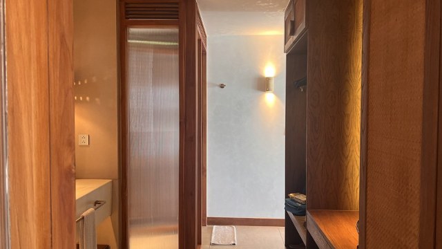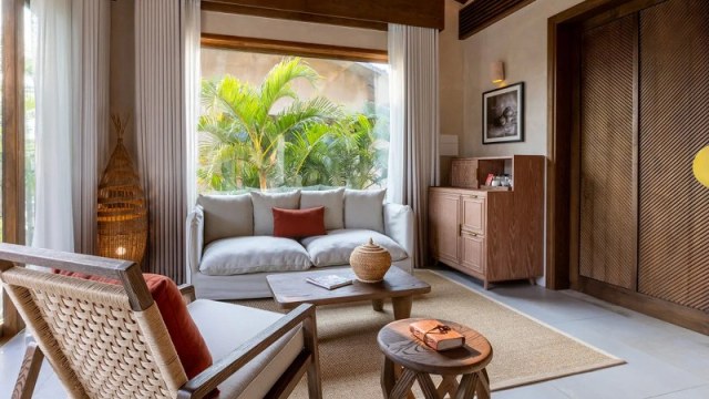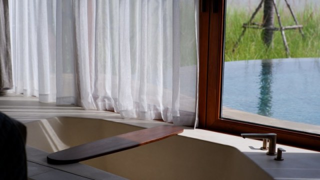 ทุกวิลล่ามีสระว่ายน้ำส่วนตัว และมี sunken bathtub อยู่ในห้องนอน เราเปิดประตูกระจกให้โล่ง แล้วปล่อยลมธรรมชาติไหลผ่านเข้ามาในห้อง แสงแดดอ่อนลอดผ่านผ้าโปร่ง เสียงน้ำกระทบสระเบา ๆ ทุกอย่างเหมือนค่อย ๆ บอกให้เราปล่อยเรื่องวุ่นวายออกจากหัวทีละนิด