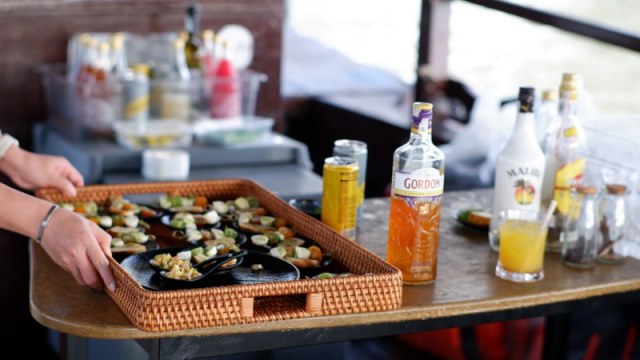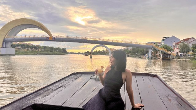 พอตกเย็น รีสอร์ตแนะนำ Sunset Cruise เป็นเรือไม้ขนาดกลางล่องไปตามแม่น้ำ Thu Bon มุ่งหน้าไปทางเมืองเก่าฮอยอัน บนเรือมี Mixologist คอยมิกซ์เครื่องดื่มเย็น ๆ ให้เราได้จิบไป ดูพระอาทิตย์ค่อย ๆ ลับขอบฟ้าไป