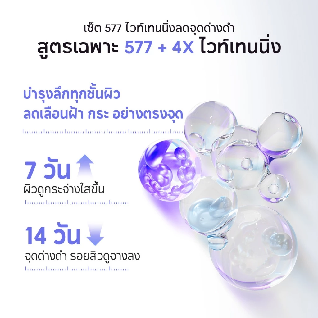 หัวใจหลักของเซ็ตนี้คือ สาร 577 สูตรเฉพาะ ที่เน้นยับยั้งกระบวนการสร้างเม็ดสีเมลานินตั้งแต่ต้นทาง พร้อมหยุดการส่งผ่านเม็ดสีไปยังผิวชั้นบน