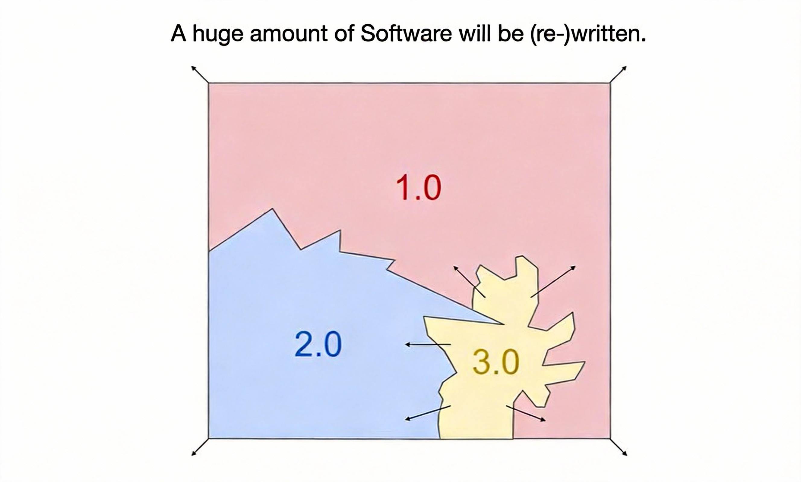 จากประสบการณ์ตอนทำงานที่ Tesla, Karpathy สังเกตว่า โค้ดแบบ 2.0 กินพื้นที่แทน 1.0 มากขึ้นเรื่อยๆ เพราะฉลาดกว่า ปรับตัวได้มากกว่า และตอนนี้ก็เริ่มเข้าสู่ยุคที่ Software 3.0 กำลังกิน 2.0 ต่ออีกชั้น