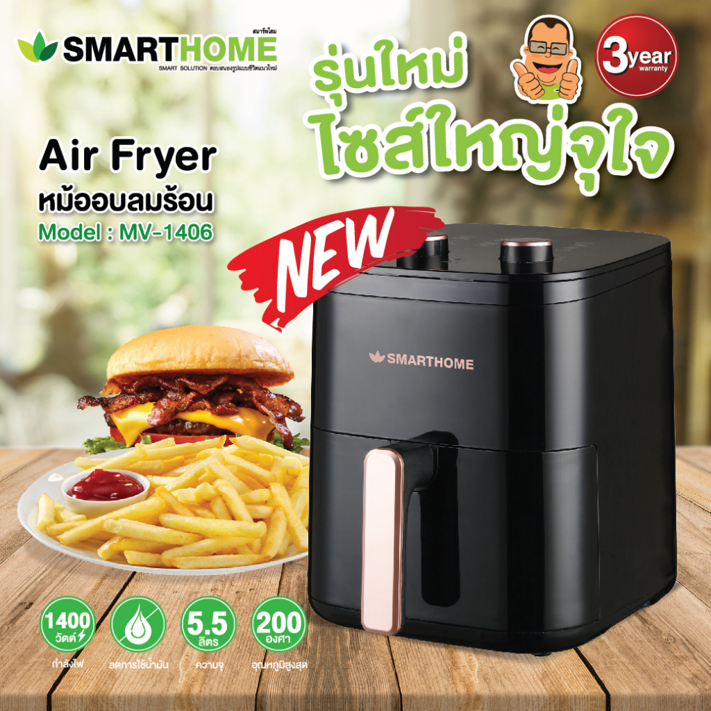 SMARTHOME หม้อทอดไร้น้ำมันขนาด 5.5 ลิตร รุ่น MV-1406 เป็นอุปกรณ์ทำอาหารที่ให้ทั้งความสะดวก ความรวดเร็ว และความคล่องตัวในครัว ความจุใหญ่ ฟังก์ชันครบ อุณหภูมิปรับได้กว้าง วัสดุทนทาน และการรับประกัน 3 ปี ทำให้รุ่นนี้เหมาะกับการใช้งานจริงในบ้านยุคใหม่ที่ต้องการทำอาหารให้สะดวกและสะอาดขึ้น โดยไม่ต้องพึ่งน้ำมันมากเหมือนการทอดแบบเดิม