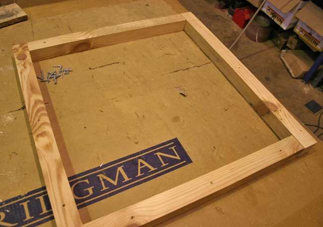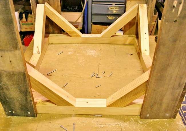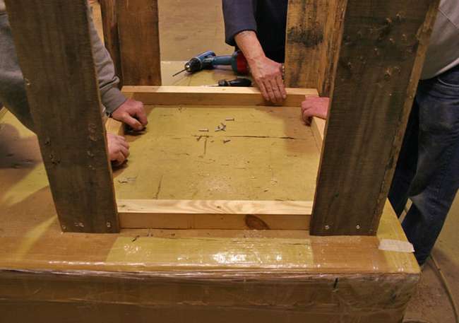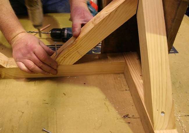 ประกอบขาเข้ากับฐาน และอาจเสริมแผ่นไม้สามเหลี่ยมที่มุมเพื่อเพิ่มความมั่นคง